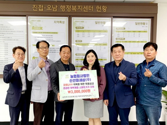 농업회사법인 신선미세상(주)(대표 손우기)은 코로나19로 인한 온라인 개학 시행으로 어려움을 겪고 있는 취약계층을 위해 후원금 300만원을 북부희망케어센터에 기탁했다. 이번 후원금은 사상 초유의 온라인 수업으로 특히 경제적 어려움을 겪고 있는 취약계층 청소년에게 스마트 기기를 지원하는 '땡큐 스마트 기부 사업'에 사용될 예정이다. 손우기 대표는 "남양주시땡큐스마트기부사업에 동참할 수 있게 되어 더욱 보람을 느낀다. 미래를 이끌어갈 청소년들에게 이번 기부가 작지만 큰 힘이 되기를 바란다."고 전했다.