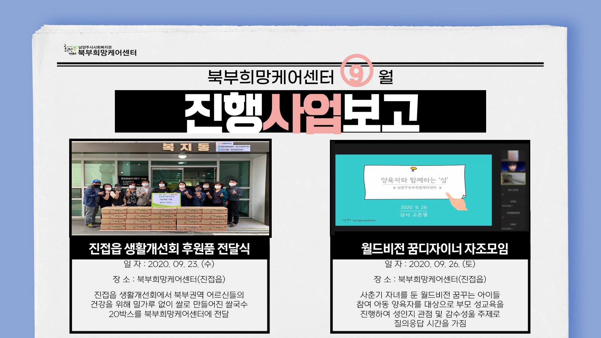북부희망케어센터는 지난 2020년 9월 지역사회와 다양한 사업을 진행하였습니다. 항상 북부희망케어센터와 지역사회를 위해 나눔을 해주시는 모든 분께 감사드립니다. 자세한 내용은 이미지를 참고해주세요.