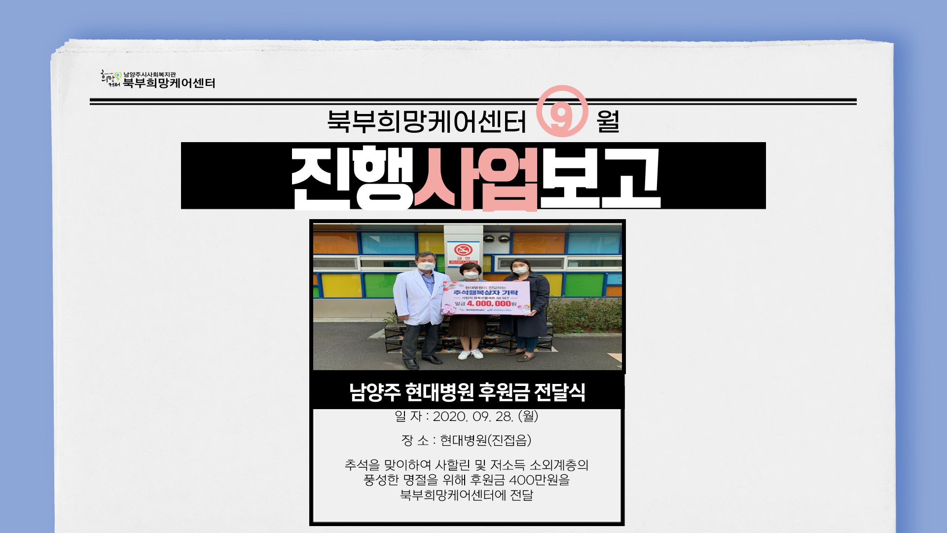 북부희망케어센터는 지난 2020년 9월 지역사회와 다양한 사업을 진행하였습니다. 항상 북부희망케어센터와 지역사회를 위해 나눔을 해주시는 모든 분께 감사드립니다. 자세한 내용은 이미지를 참고해주세요.