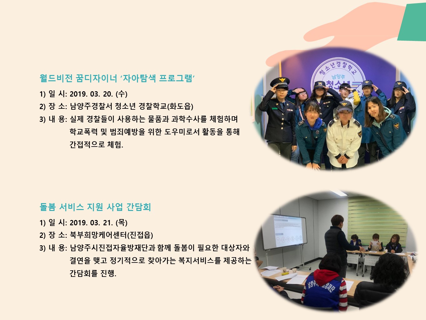 북부희망케어센터는 지난 2019년 3월 지역사회와 다양한 사업을 진행하였습니다. 항상 북부희망케어센터와 지역사회를 위해 나눔을 해주시는 모든 분께 감사드립니다. 자세한 내용은 이미지를 참고해주세요.