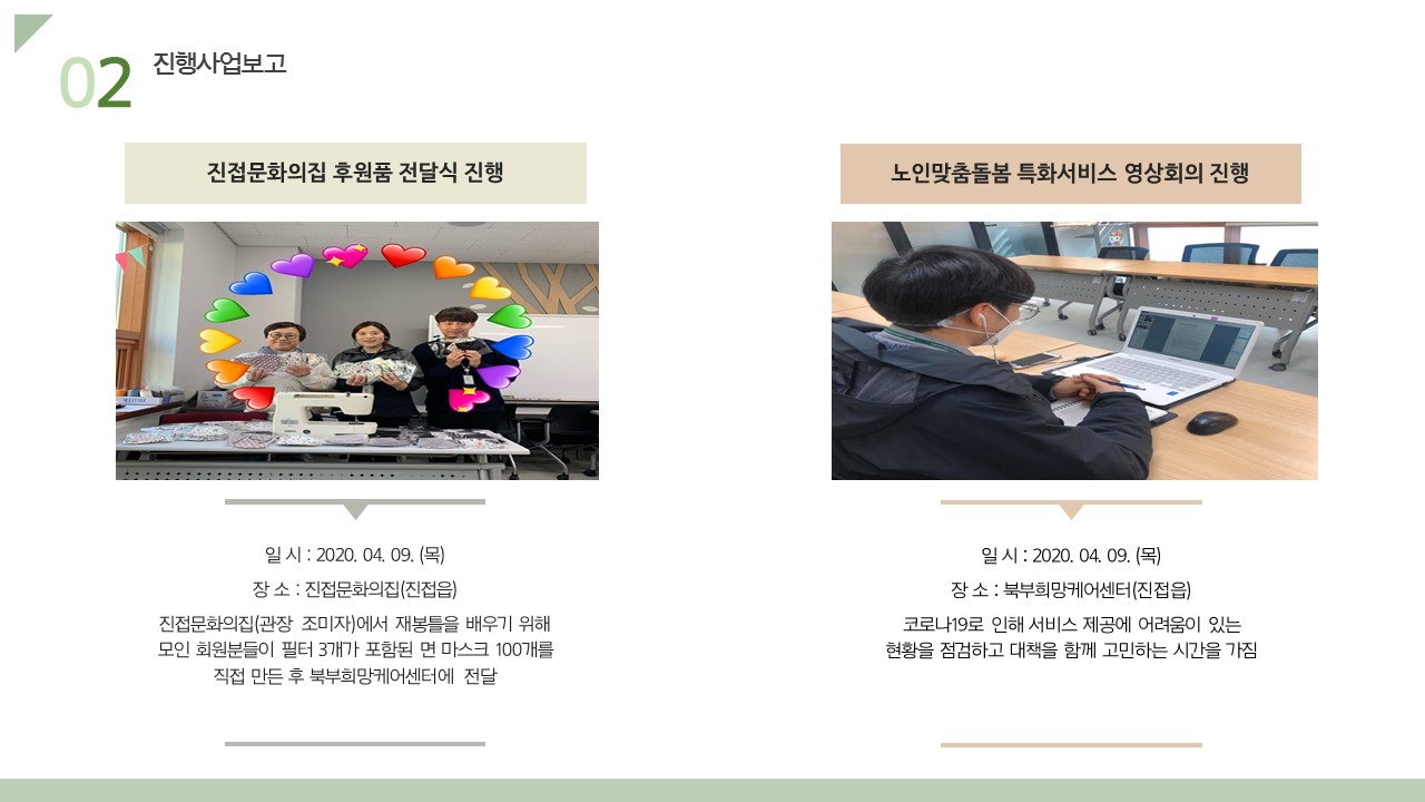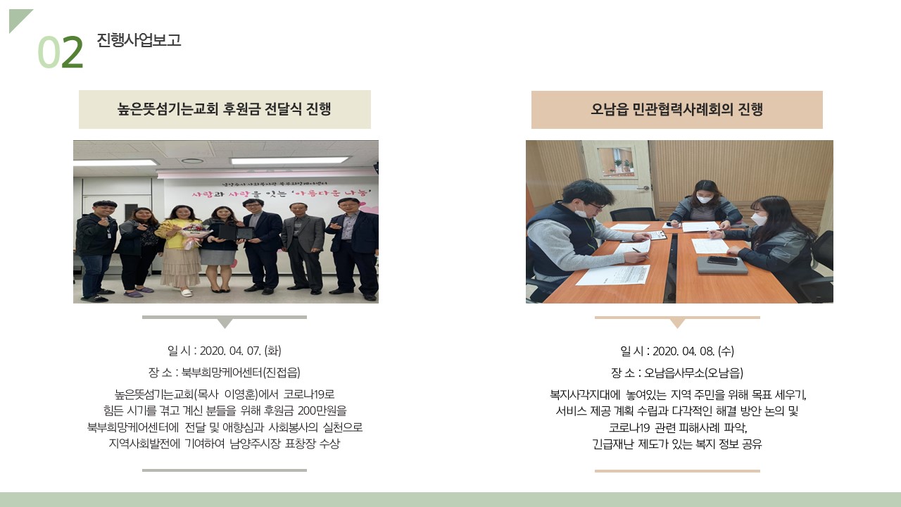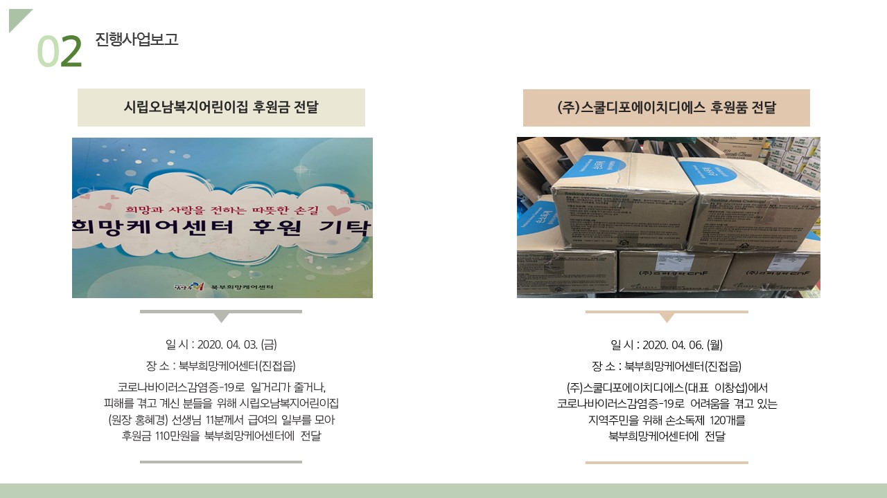 북부희망케어센터는 지난 2020년 4월 지역사회와 다양한 사업을 진행하였습니다. 항상 북부희망케어센터와 지역사회를 위해 나눔을 해주시는 모든 분께 감사드립니다. 자세한 내용은 이미지를 참고해주세요.
