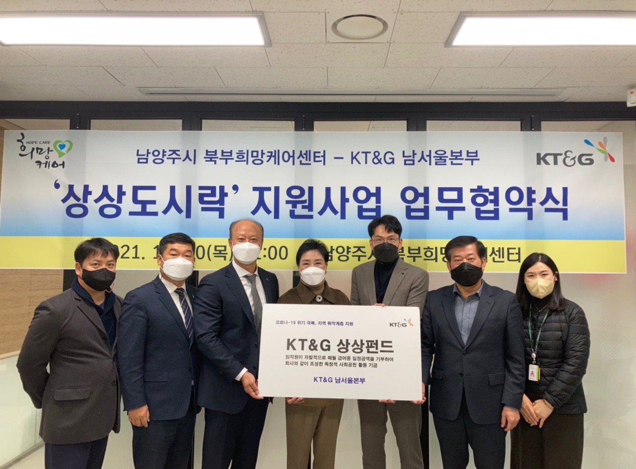 북부희망케어센터에서는 30일(목) 북부희망케어센터 회의실에서 KT&G 남서울본부(본부장 허철호)와 상상도시락 지원사업 업무협약을 체결하였습니다! 상상 도시락 지원 사업은 지역의 어려운 이웃들에게 지속적인 나눔활동을 추진하고자 남양주시의회 백선아 의원(더불어민주당·오남읍)의 추천으로 양 기관이 연계되어 진행이 되었고 특히, KT&G만의 독창적인 사회공헌 사업인 ‘상상펀드’를 통해 매달 50만원 상당의 도시락을 지원하기로 했으며, 이는 KT&G 임직원들이 급여에서 매달 자발적으로 기부한 금액과 동일한 금액을 회사가 기부하는 1:1 매칭 그랜트 제도를 통해 마련되었습니다! 상상 도시락은 북부권역(진접, 오남, 별내) 내 돌봄 소외계층을 대상으로 진행하는 돌봄 서비스‘지금, 만나러 갑니다’사업 대상자에게 지원될 예정으로 앞으로도 KT&G 남서울본부의 많은 관심 부탁드리겠습니다^^.
