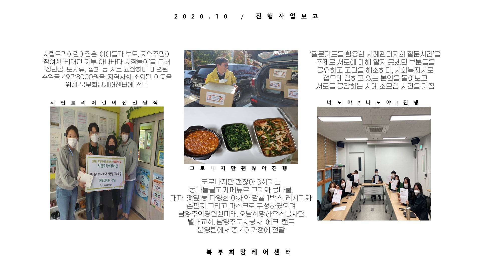 북부희망케어센터는 지난 2020년 10월 지역사회와 다양한 사업을 진행하였습니다. 항상 북부희망케어센터와 지역사회를 위해 나눔을 해주시는 모든 분께 감사드립니다. 자세한 내용은 이미지를 참고해주세요.