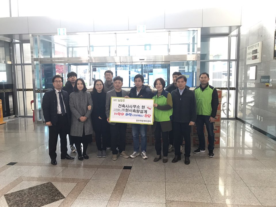 동부희망케어센터 동부희망케어센터 (주)현서측량설계 사랑의 라면전달 등록일자 2019-12-13 조회 178 내용 (주) 현서측량설계(대표 맹규영)가 동부희망케어센터에 후원물품을 전달했습니다. 전달한 후원물품은 라면 200 box로 (주)현서측량설계의 직원분들이 함께 모금하여, 전달하게되었다고 합니다. (주)현서측량설계는 직원분들이 지역사회를 위해 밑반찬 배달 봉사를 하는 등 다양한 활동을 하고 있습니다. 첨부파일 현서측량 라면 전달.jpg [ Size : 134.27KB, Down : 62 ] 미리보기 다운로드 목록보기