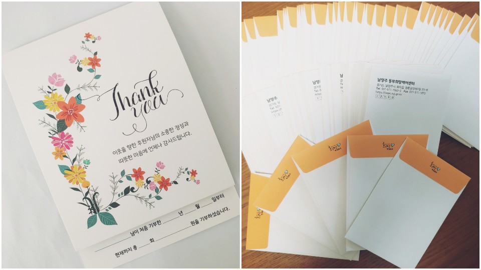 동부희망케어센터에서는 매월 후원을 해주시는 후원자님들에게 감사문자를 발송하고 있습니다. 매월 감사문자를 발송하지만, 후원자님이 저희 동부희망케어센터와 지역의 도움이 필요한 이용자들을 생각하는 후원자님들의 마음에 비하면 우리의 마음의 전달이 부족하지 않나 고민을 하였습니다. 그러다, 이번 감사의 카드를 생각하게 되었습니다. 이번 감사카드는 정기적으로 후원을 유지해주시고 있는 후원자님들 약 1,000분에게 발송을 진행하고 있습니다. 감사카드는 감사 인사와 사용 용도에 대하여는 인쇄 작업을 진행하였으며, 후원자님의 성함과 후원 시작 날짜, 횟수, 금액에 대하여는 손글씨로 정성스럽게 작성하였습니다. 간혹 기존에 등록되어 있던 주소지와 현주소지가 상이하여 감사카드가 발송되지 못하는 경우가 있으니, 10월 31일까지 카드를 받지 못하신 경우 동부희망케어센터로 연락하여 주소지 변경 요청을 부탁드립니다. 감사합니다. 연락처 : 031-511-1062 (동부희망케어센터) 담 당 : 윤미정 사회복지사