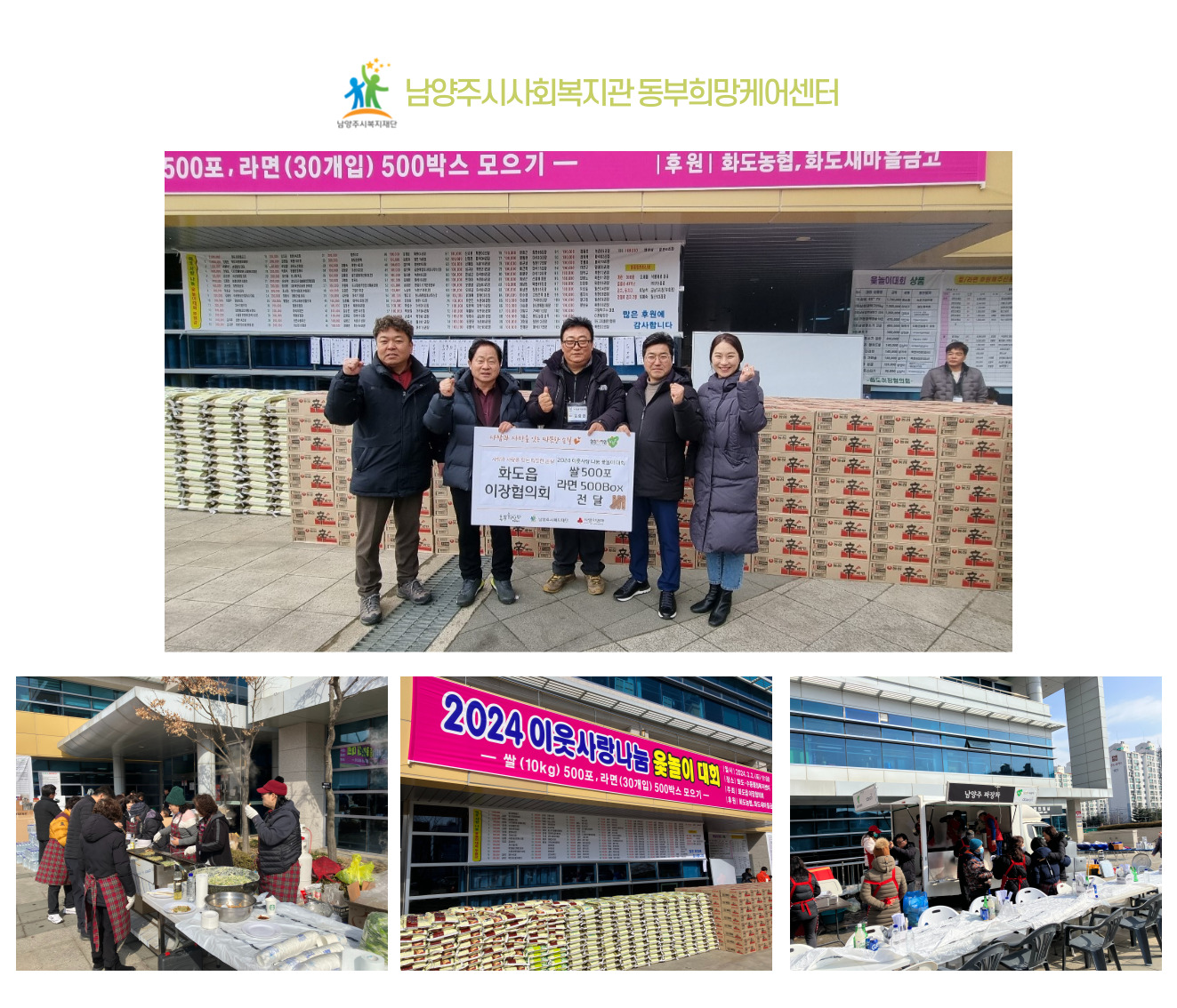 안녕하세요, 동부희망케어센터 입니다~ 따스한 봄 기운이 느껴지는 오늘, 활기찬 3월 보내고 계신가요? 저희는 지난 토요일 화도읍이장협의회에서 주최한 이웃 사랑 나눔 윷놀이 대회에 다녀왔습니다! 이번 척사대회에서는 화도읍 지역 사회단체 회원 등 300여명이 윷놀이를 하며 이웃 간 따뜻한 정을 나누는 화합의 시간을 가졌는데요, 화도읍이장협의회에서는 지역 주민이 건강하고 풍성한 한해가 되길 바라는 마음으로 쌀 500포와 라면 500박스를 전달해주셨습니다. 전달해주신 쌀과 라면은 지역의 필요하신 가정에 배분하도록 하겠습니다. 후원해주신 화도읍이장협의회에 다시 한번 감사의 말씀드립니다.