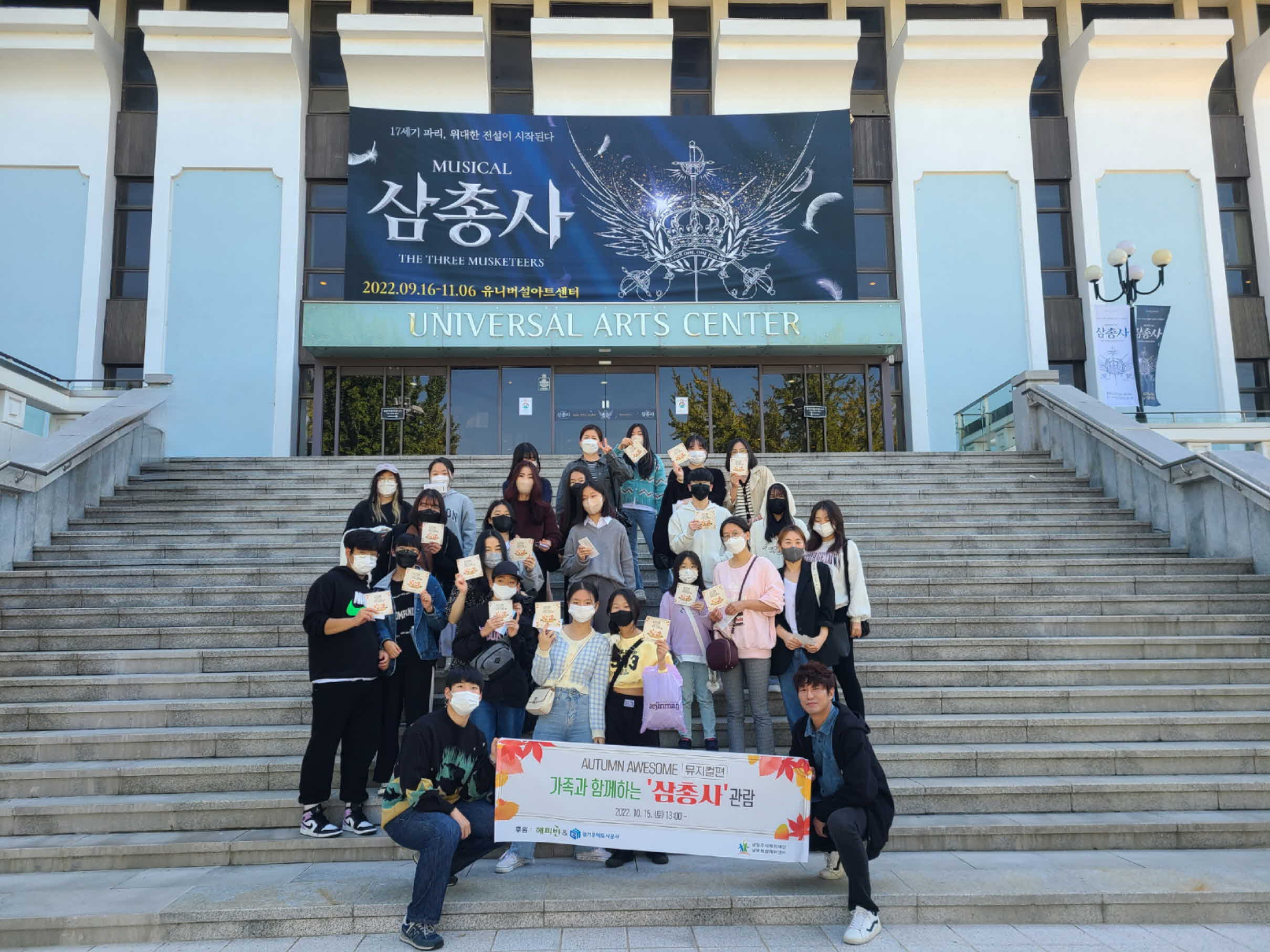 우리 남부희망케어센터에서는 서울시 광진구에 위치한 유니버설아트센터에서“Autumn Awesome : 뮤지컬편”이라는 이름으로 아동, 청소년 가정 30명(12가정)이 ‘삼총사’뮤지컬 관람을 지원했습니다!