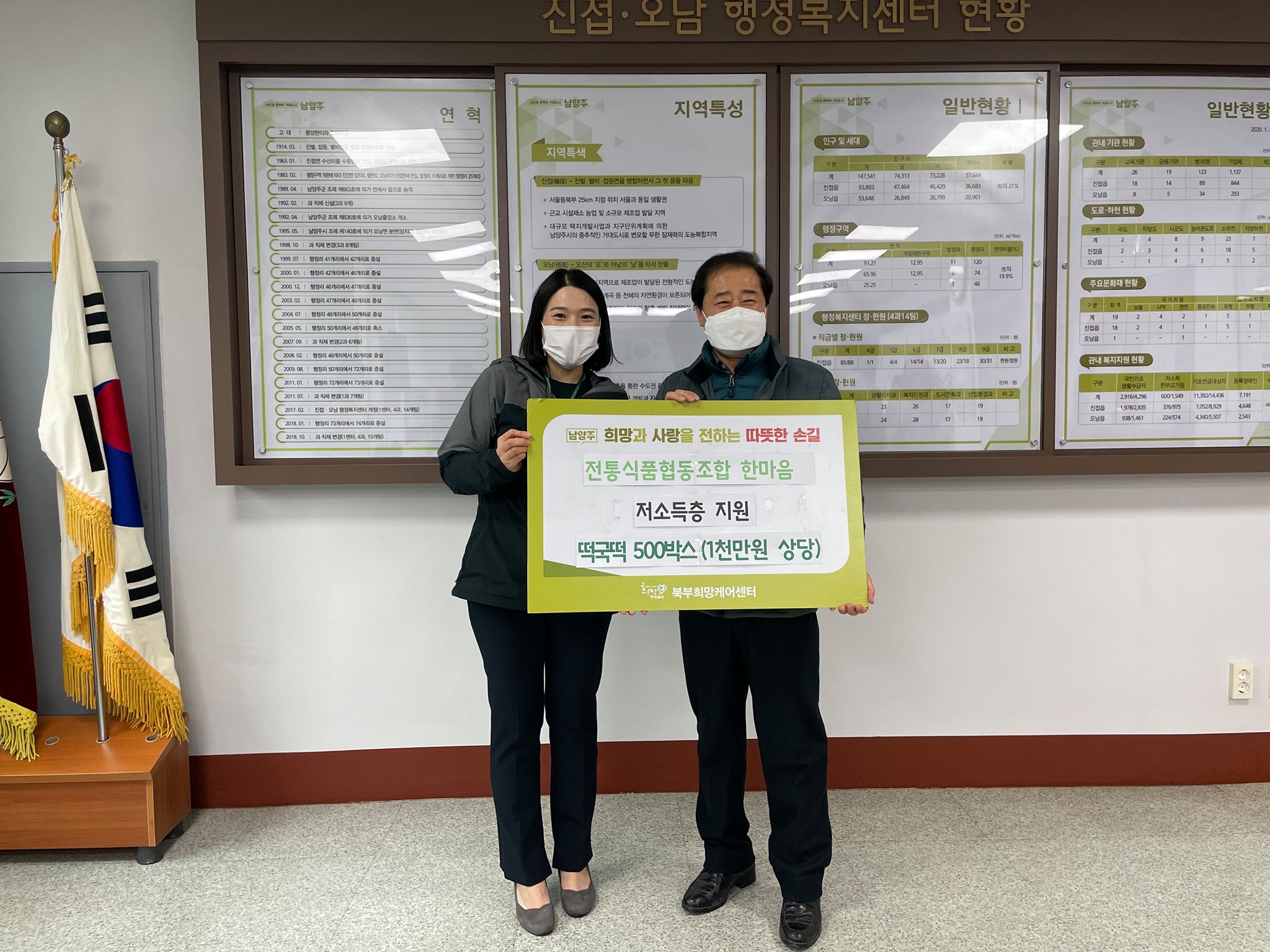 북부희망케어센터에서는 전통식품협동조합 한마음과 전달식을 진행하였습니다. 다가오는 2월에 설날이 찾아오지만 코로나-19로 인해 가족, 친척, 이웃분들과 함께 하지 못하는 분들을 생각하며 떡국떡 2kg 500박스를 전달하게 되었습니다. 이날 후원된 떡국떡은 지역의 어르신들께 따뜻한 마음을 함께 담아 전달할 수 있도록 하겠습니다. 감사합니다.