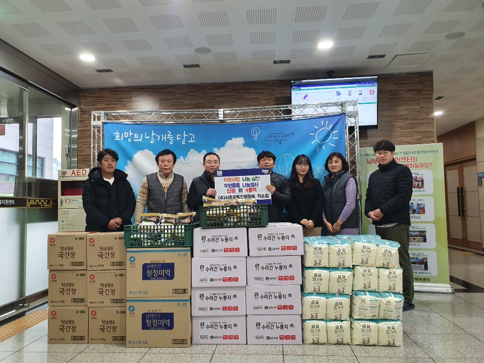 ㈜서준유통 진로마트 덕소점(대표 양해성)은 지난 10일, 지역 내 소외된 이웃을 위해 사용해달라며 식료품을 남부희망케어센터(센터장 김기수)에 기탁했다. 기탁받은 후원물품은 300만원 상당의 식료품(찹쌀, 밀가루 등 5종)으로 구성되어 남부희망케어센터 나눔마켓 이용자들에게 지원될 예정이다. 남부희망케어센터 김기수 센터장은 “불황 속에서도 어려운 이웃들을 위해 나눔을 실천해주심에 감사의 말씀을 전한다.”고 말했고, 양해성 대표는 "신종 코로나 바이러스 및 여러 어려운 상황에 놓여 지역사회 어려운 분들이 더 신경쓰였다. 이웃들에게 우리의 마음이 전달되기를 바라며, 현 상황을 잘 극복해나가기를 바란다."며 소감을 전했다. ㈜서준유통 진로마트 덕소점에서는 지역사회 소외된 이웃들을 위해 내방 고객들의 구매 적립금을 모으는 나눔행사를 진행한 바 있으며 지역 내 대표 마트로서 복지 발전을 위해 지속적으로 관심을 갖고 나눔을 실천해 지역 주민들에게 귀감이 되고 있다.