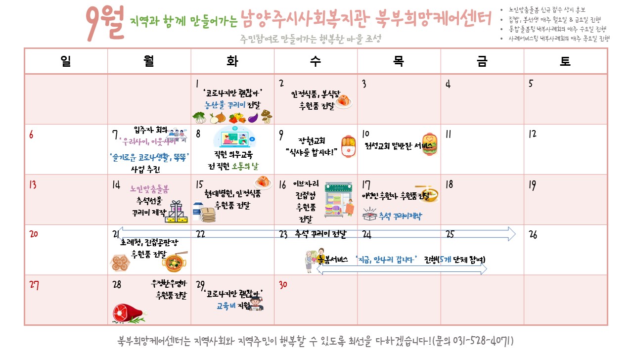 북부희망케어센터에서는 [북부희망케어센터 캘린더]를 통해 센터에서 진행하고 있는 사업 및 전달식을 공유하고자 합니다. 항상 북부희망케어센터와 지역사회를 위해 나눔을 해주시는 모든 분께 감사드립니다. 자세한 내용은 이미지를 참고해주세요. [9월 진행 사업은 코로나19 확산 속도에 따라 변동될 수 있음을 알려드립니다.
