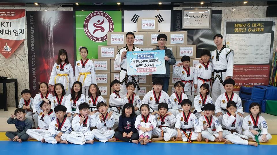경기 남양주시 진접읍의 엄지태권도(관장 강세웅)은 지난 31일 지역사회 소외계층을 위하여 남양주시사회복지관 북부희망케어센터(센터장 류시혁)에 라면 1,602개와 양말 100켤레, 그리고 일일장터 행사를 진행해 마련한 후원금 474,500원을 전달했다. 이날 전달된 후원금품은 지역사회 저소득 가정을 위하여 관장님과 원생, 학부모님들이 한마음이 되어 2018년 1년 동안 자발적으로 함께라면, 나눔장터 행사를 통해 십시일반 모아 마련하였다. 엄지태권도 강세웅 관장은 “아이들이 자발적으로 기부한 라면과 후원금이 좋은 곳에 사용되면 좋겠다고 전하며, 매년 진행하는 나눔활동을 계기로 기부와 선행에 대해 아이들이 배울 수 있는 좋은 기회가 되고 있어서 감사한 시간이었다”고 밝혔다.