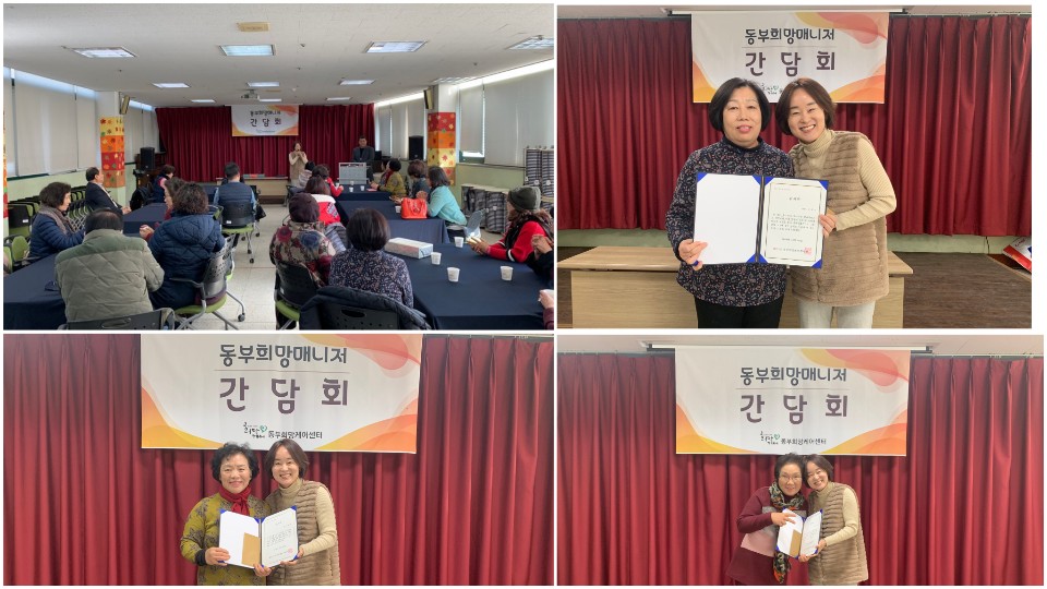 2019년 한 해를 마무리하며, 언제나 동부희망케어센터와 함께하는 동부희망매니저들과 간담회를 진행했습니다. 한 해 동안 수고하신 동부희망매니저들의 활동 이야기를 듣고, 수고하신 희망매니저들 중 몇분에게 감사장을 전달하였습니다. 1부, 2부로 진행된 동부희망매니저 간담회는 2020년 새롭게 시작하는 맞춤형돌봄사업을 소개하는 시간을 가졌으며, 올해보다 더 성장하며 발전하는 새해를 다지는 뜻 깊은 시간이었습니다.