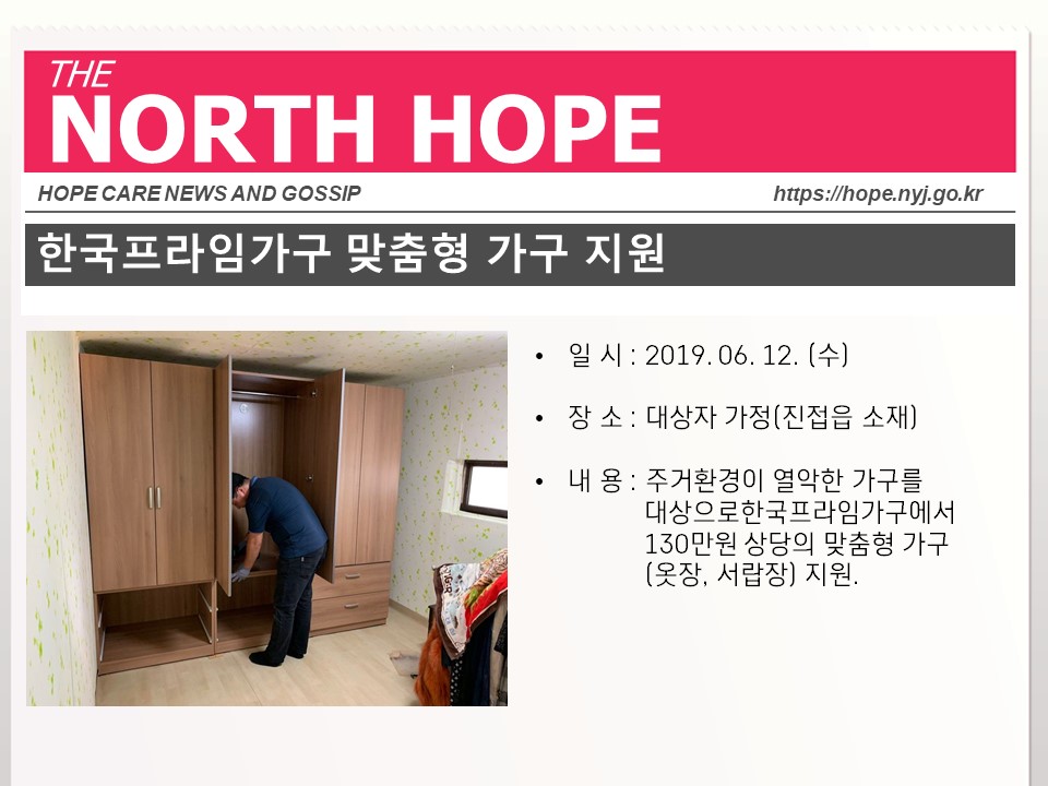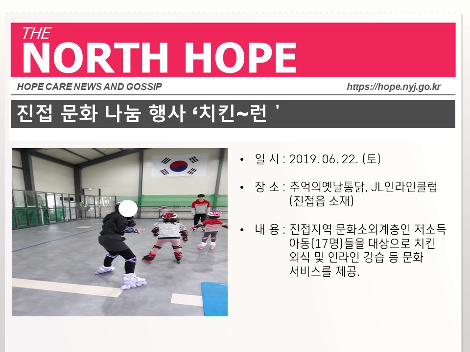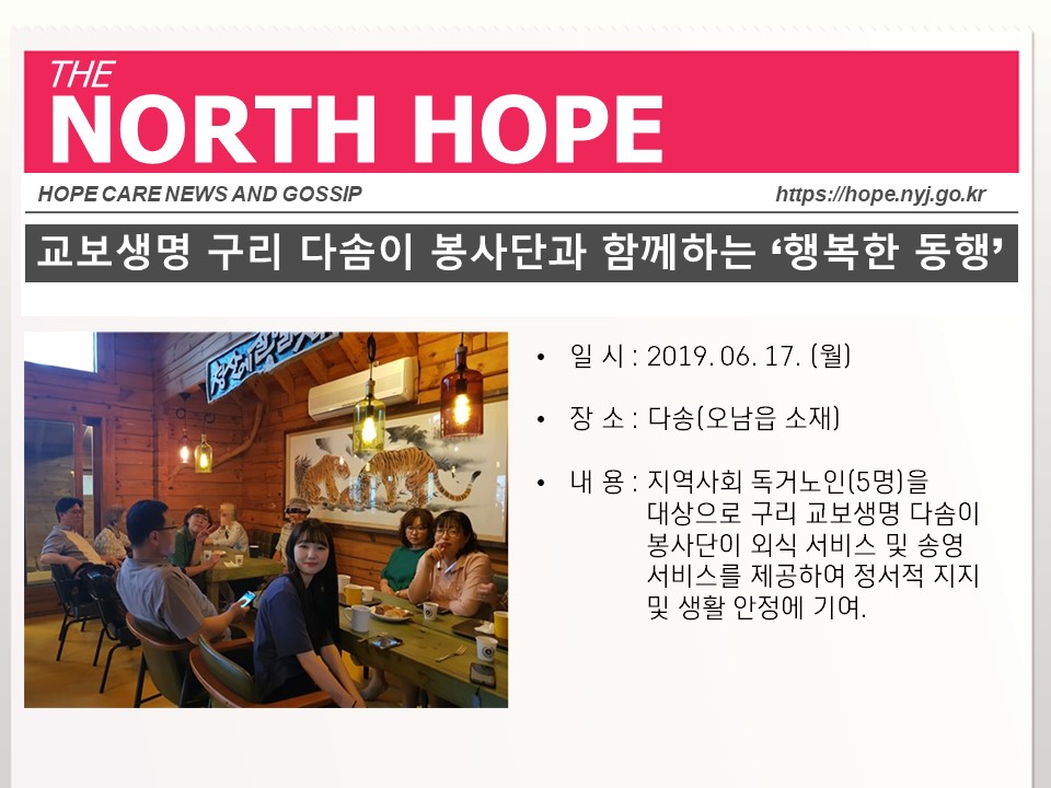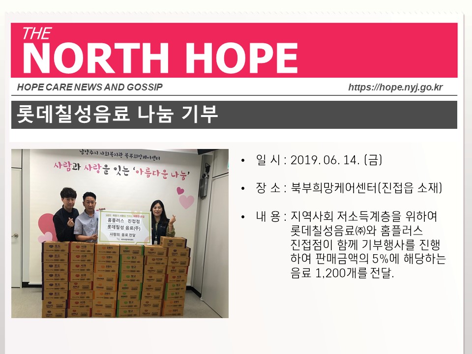 북부희망케어센터는 지난 2019년 6월 지역사회와 다양한 사업을 진행하였습니다. 항상 북부희망케어센터와 지역사회를 위해 나눔을 해주시는 모든 분께 감사드립니다. 자세한 내용은 이미지를 참고해주세요.