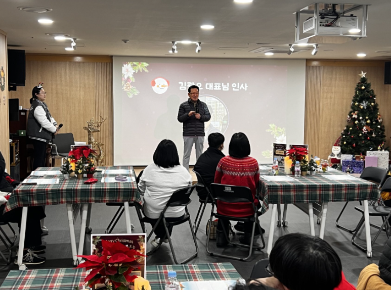 우리 센터는 지난 15일(금), 다문화가족분들과 함께 크리스마스 행사를 진행했습니다. 이번 행사는 김광오대표와 손주 김나율·김건률 후원을 통해 우리나라 문화에 익숙하지 않은 다문화가족을 대상으로 가족게임, 케이크 만들기, 선물 전달식 등 크리스마스 파티를 함께 즐기는 시간으로 마련되었습니다! 한 참여자는 “매 년 가족들과 시간을 보냈는데, 이렇게 다른 가족과 파티를 함께 하니 더 즐겁고 기뻤던 것 같다.”라며, “여름 나들이 때 봤던 가족들도 있어 반갑기도 했고, 어색함 없이 파티를 즐길 수 있었다.”라고 소감을 전해주셨습니다. 파티에 참여한 모든 가족들이 즐겁고 행복한 연말을 보내길 바랍니다 :)