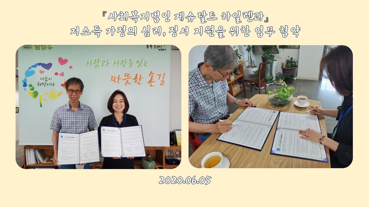 동부희망케어센터 동부희망케어센터, 사회복지법인 게슈랄트 하이렌과 업무 협약식 진행 등록일자 2020-06-23 조회 169 내용 동부희망케어센터와 사회복지법인 게슈탈트 하이렌과 업무 협약식을 진행했다. 이번 협약식에서는 저소득층 및 사회취약계층을 위한 심리치료 및 장학사업등을 위해 설립되었으며 특히 한부모 가족복지상담센터를 통한 중위소득 100%이내의 한부모 가정에 대하여 무료 심리치료 서비스를 제공할 예정입니다. 첨부파일 11)게슈탈트.jpg [ Size : 185.1KB, Down : 56 ] 미리보기 다운로드 목록보기