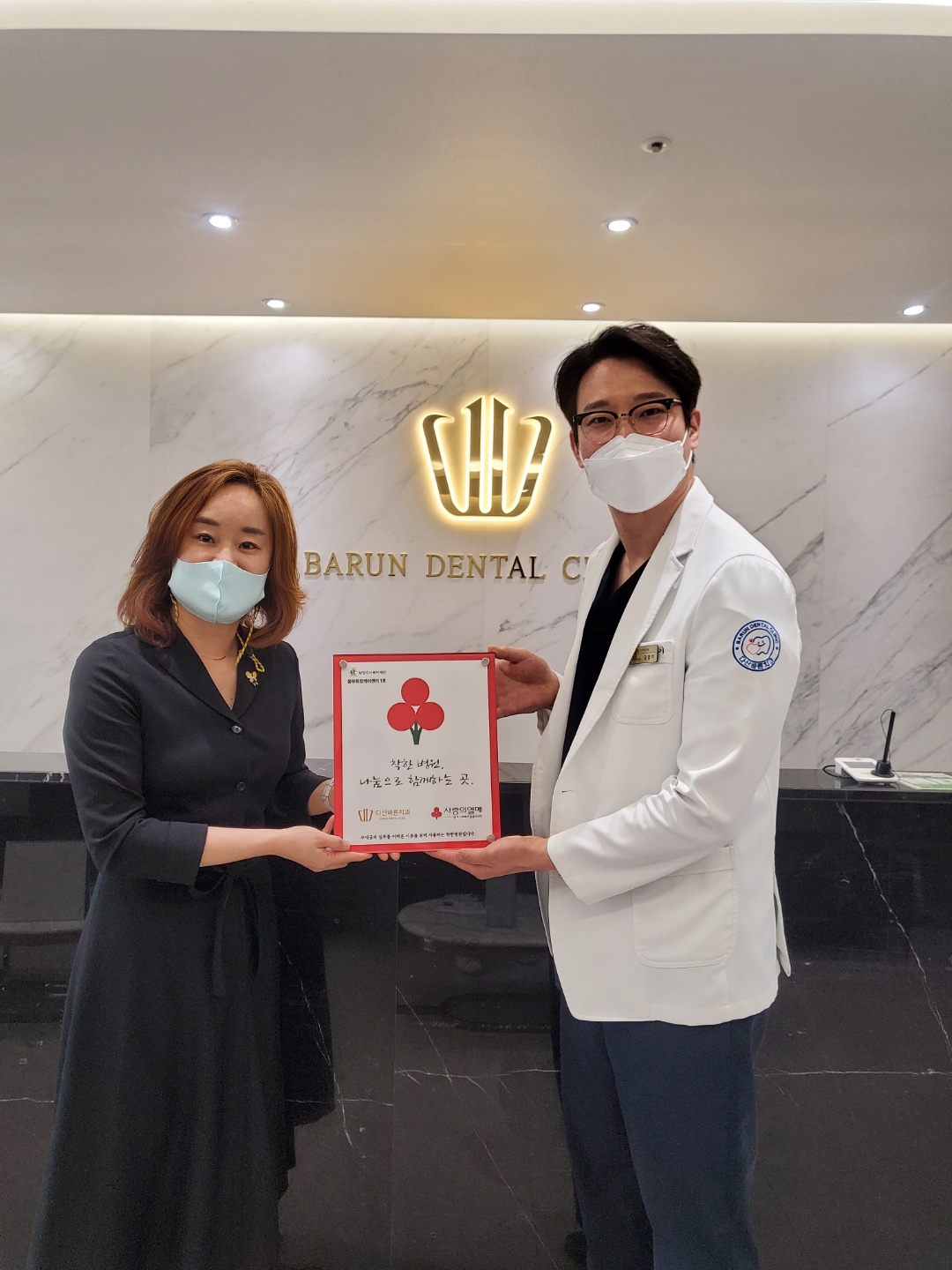 안녕하세요. 살짝 더운 봄이지만, 5월의 푸른 나뭇잎처럼 상큼하고 행복한 소식이 있어 여러분들께 전하고자 합니다. 남양주시복지재단을 통해 매월 수익금의 일정 금액을 기부하는 다산바른치과와 지난 5월 12일 현판 전달식을 가졌습니다. ‘착한가게 현판’은 매월 수익금의 일정 금액을 어려운 이웃을 위해 기부하는 사업장에 전달되는데, 남양주시복지재단에 기탁한 기부금은 향후 관내 어려운 이웃을 위한 복지사업에 쓰여지게 됩니다. 다산바른치과 김정기원장은 꾸준히 활동하고 있는 동부희망케어센터를 보며 지속적인 나눔 활동을 해주시는 선물 같은 분이십니다. 앞으로도 다산바른치과의 선한 영향력과 이웃들에게 희망을 나누는 삶을 남양주시복지재단 동부희망케어센터가 응원합니다.