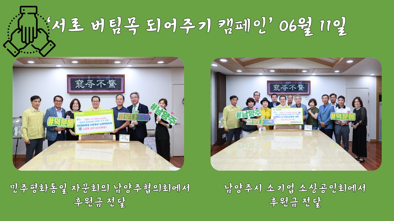 동부희망케어센터 동부희망케어센터, 민주평화통일 자문회의 남양주협의회와 남양주시 소기업 소상공인회에서 기부금 전달식 등록일자 2020-06-23 조회 204 내용 6월 11일에 진행한 전달식은 민주평화통일 자문회의 남양주협의회에서 500만원, 남양주시 소기업 소상공인회 일동에서 3,657,777원을 후원했다. 후원금은 코로나19로 온라인학습에 필요한 스마트기기를 지원하는데 사용될 예정입니다. 첨부파일 13)06.11 후원금전달식.jpg [ Size : 193.36KB, Down : 56 ] 미리보기 다운로드 목록보기