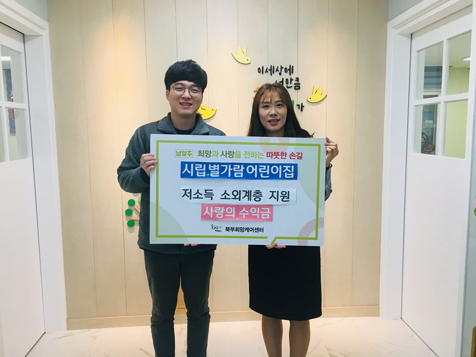남양주시 별내동 소재 시립별가람어린이집(원장 이진)에서는 지역사회 소외계층을 위하여 원생들과 학부모가 함께하는 시장놀이를 진행하여 수익금(385,000원)을 남양주시사회복지관 북부희망케어센터(센터장 류시혁)에 전달하였다.