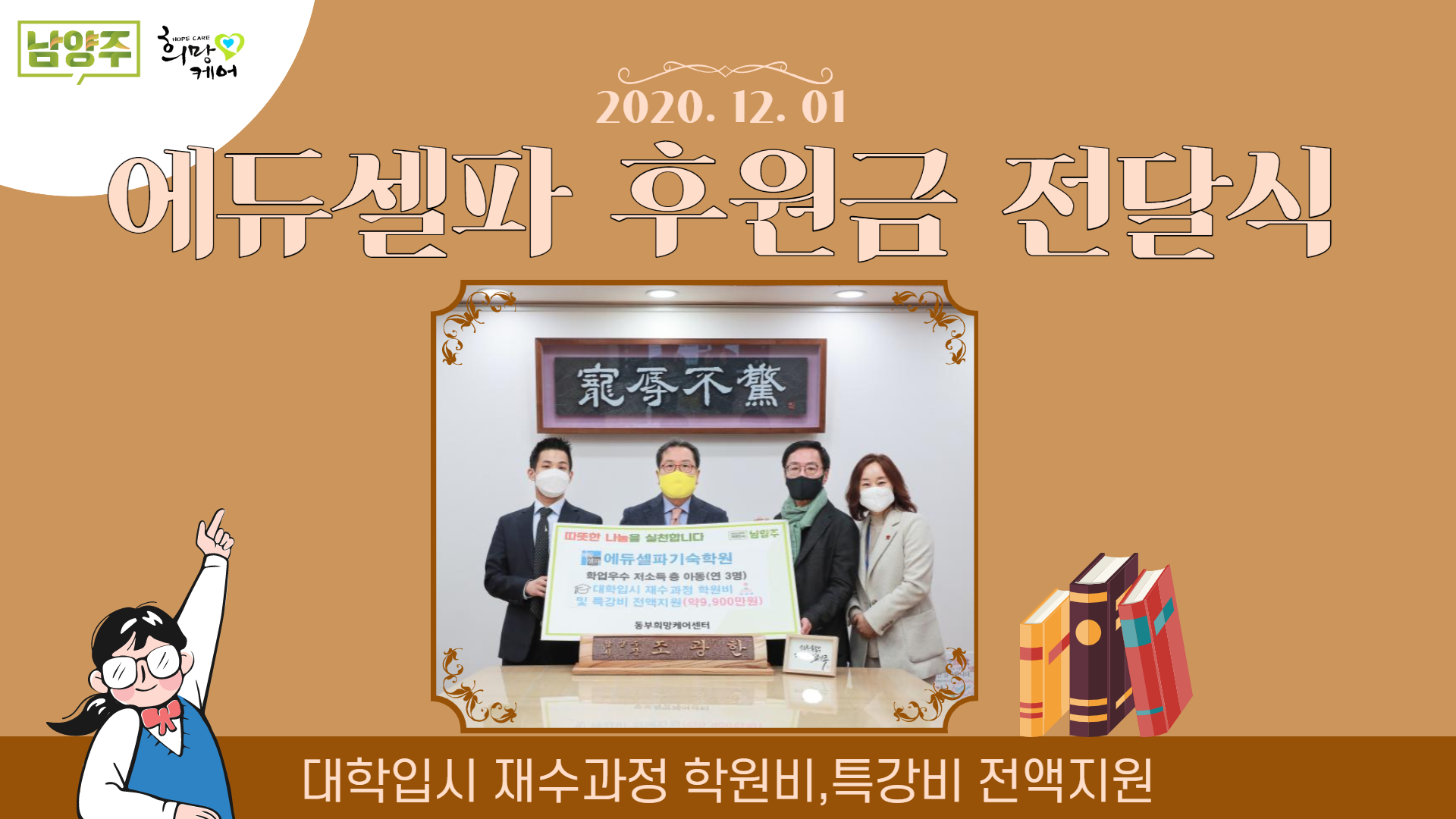 동부희망케어센터 동부희망케어센터, <에듀셀파 기숙학원> 후원금 전달식 등록일자 2020-12-14 조회 173 내용 12월 1일(화)에 에듀셀파 기숙학원에서 약 9,900만원 후원금 전달식이 있었습니다. 이 후원금은 저소득층 청소년들을 위한 입시 학원비 및 특강비를 전액 지원을 해주시기로 하였습니다. 월 275만원씩 일년간 지원되는 후원으로 화도읍에 거주하는 학생들에게 필요한 후원금입니다. 후원 감사합니다~! 첨부파일 73 서로버팀목_1210.jpg [ Size : 745.71KB, Down : 52 ] 미리보기 다운로드 목록보기