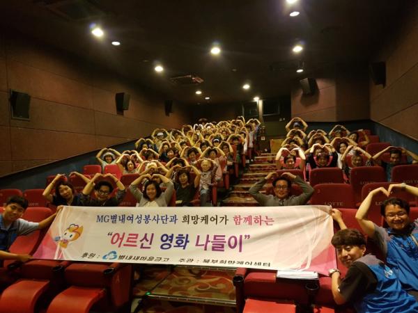 남양주시 북부희망케어센터와 새마을금고 별내본점은 지난 23일, 지역 내 저소득어르신 40분을 모시고 문화체험 나들이에 나섰다 ‘손에 손 잡고 함께해서 더 좋은 나들이’라는 주제로 진행된 이번 나들이는 상대적으로 문화체험의 기회가 적은 어르신들을 모시고 진접 롯데시네마를 방문하여 흥행중인 코미디 영화‘탐정 리턴즈’를 관람하고 영화가 끝난 후에는 맛있고 영양이 풍부한 외식서비스까지 진행했다. 이번 나들이에는 새마을금고에서 3개월간 다양한 교육을 수료한 MG여성대학봉사단 25명이 자원봉사에 참여하여 어르신들과 즐거운 시간을 보냈다. 남경우 새마을금고이사장은 “오늘 나들이 프로그램에 참가한 모든 분들이 더욱 건강하고 행복하길 바라며, 앞으로도 새마을금고 별내본점에서는 MG새마을금고여성대학 봉사단과 함께 지속적으로 지역사회 발전을 위한 다양한 나눔활동에 참여하겠다.”라고 말했다.