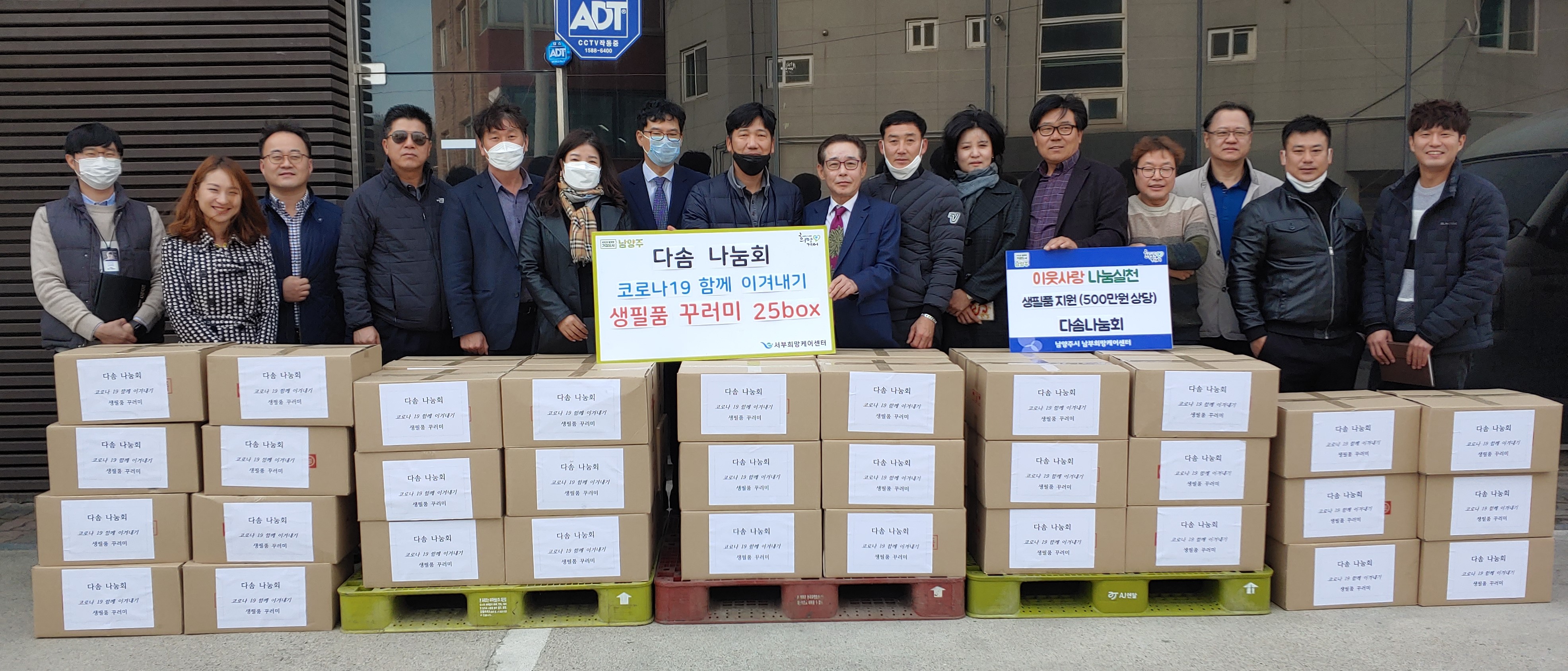 다솜나눔회(회장 조근원)에서는 지난 3월 13일, 지역 내 소외된 이웃을 위해 사용해달라며 식료품 및 생필품 50세트(500만원 상당)를 남부희망케어센터(센터장 김기수)와 서부희망케어센터(센터장 신영미)에 각각 25세트씩 기탁했다.