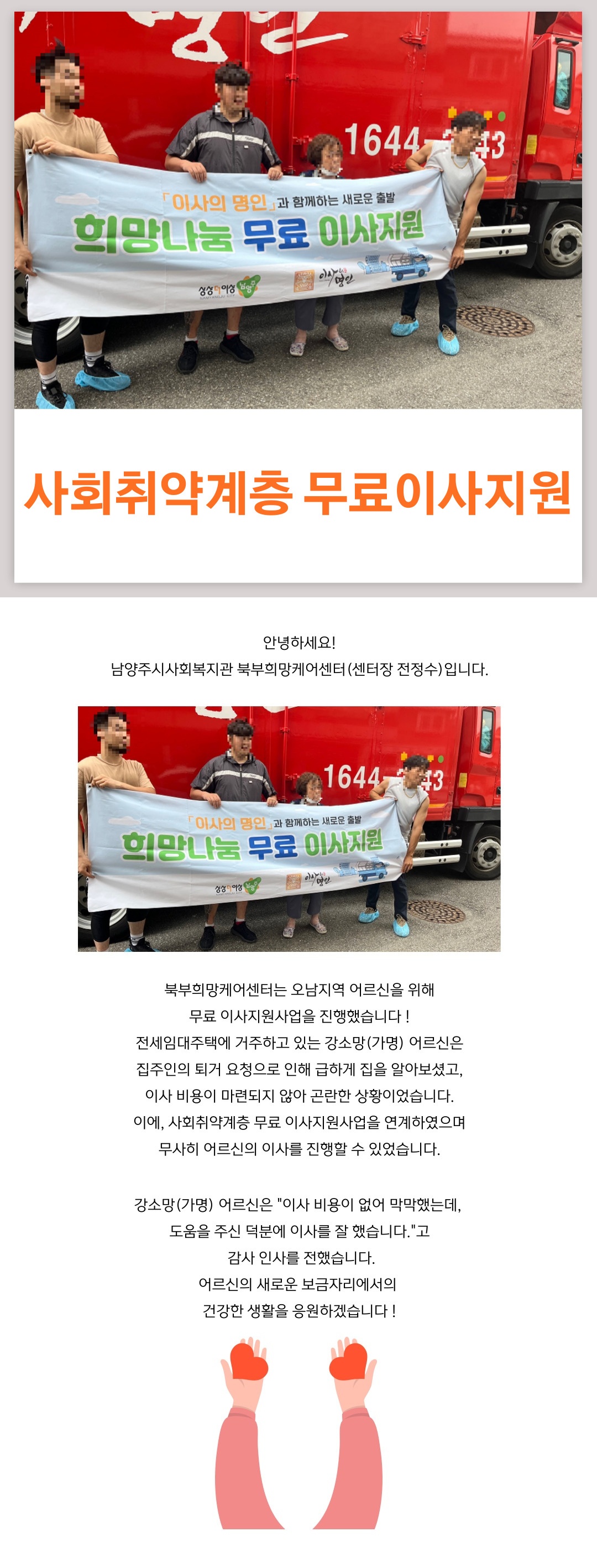 북부희망케어센터 북부희망케어센터 / 사회취약계층 무료 이사 지원 등록일자 2023-07-18 조회 243 내용 · 첨부파일 사회취약계층 무료 이사 지원.jpg [ Size : 629.3KB, Down : 73 ] 미리보기 다운로드 목록보기