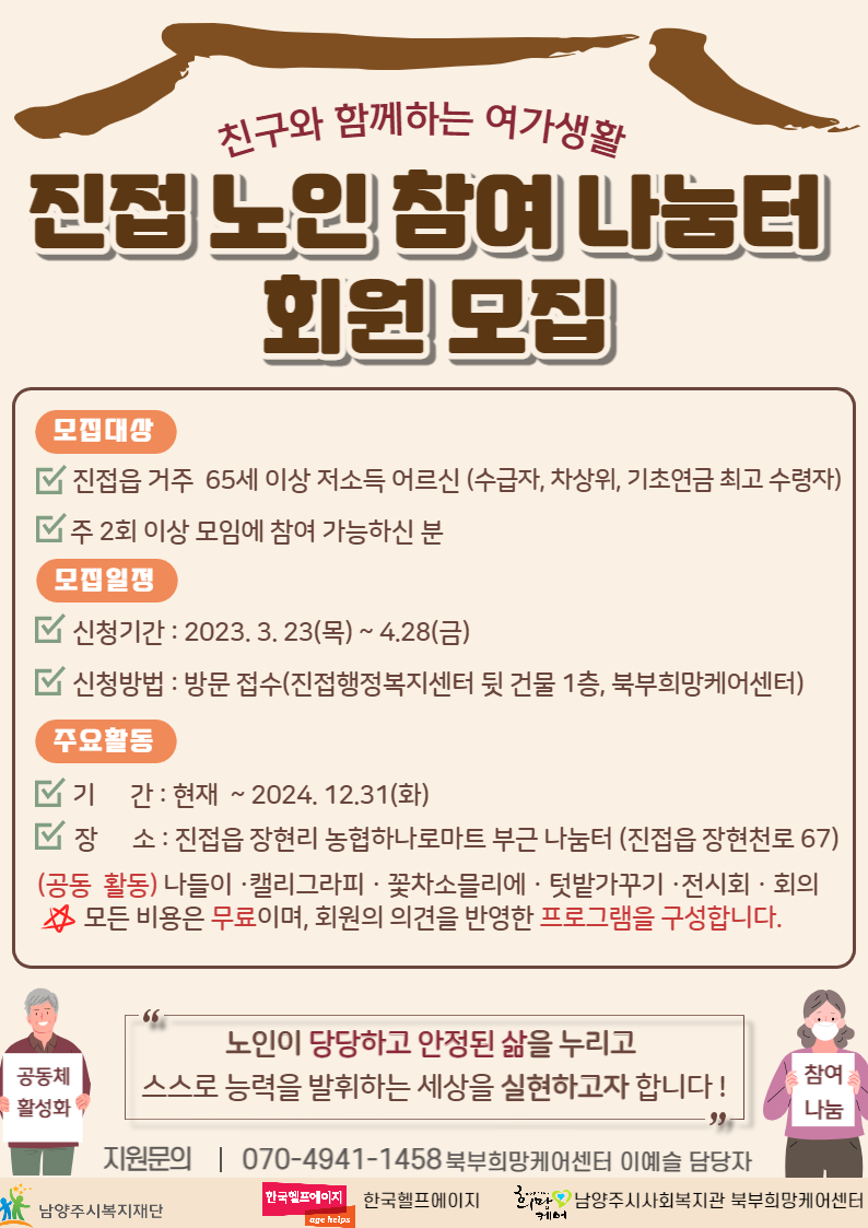 안녕하세요! 북부희망케어센터(센터장 전정수)에서 진행하고 있는 "남양주진접노인참여나눔터" 사업을 소개합니다.