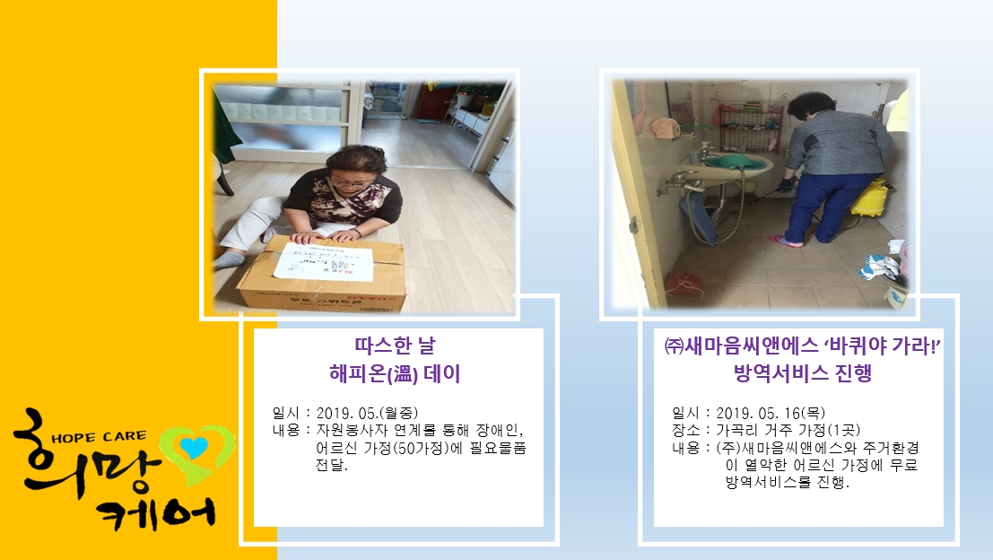 2019년 5월 동부희망케어센터는 지역사회와 함께 다양한 활동을 진행하였습니다. 지역사회의 따뜻한 관심과 사랑에 감사드립니다. 자세한 내용은 이미지를 참고해주세요.