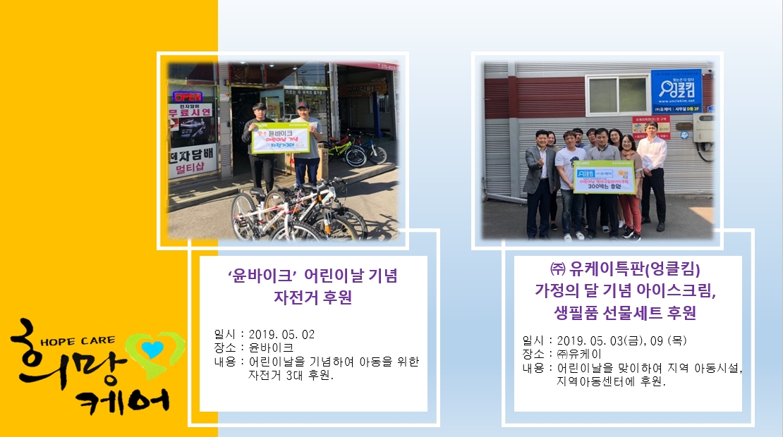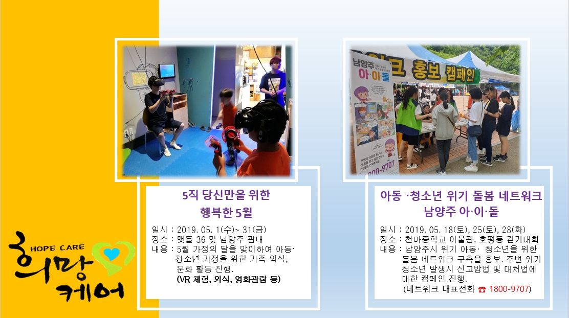 2019년 5월 동부희망케어센터는 지역사회와 함께 다양한 활동을 진행하였습니다. 지역사회의 따뜻한 관심과 사랑에 감사드립니다. 자세한 내용은 이미지를 참고해주세요.