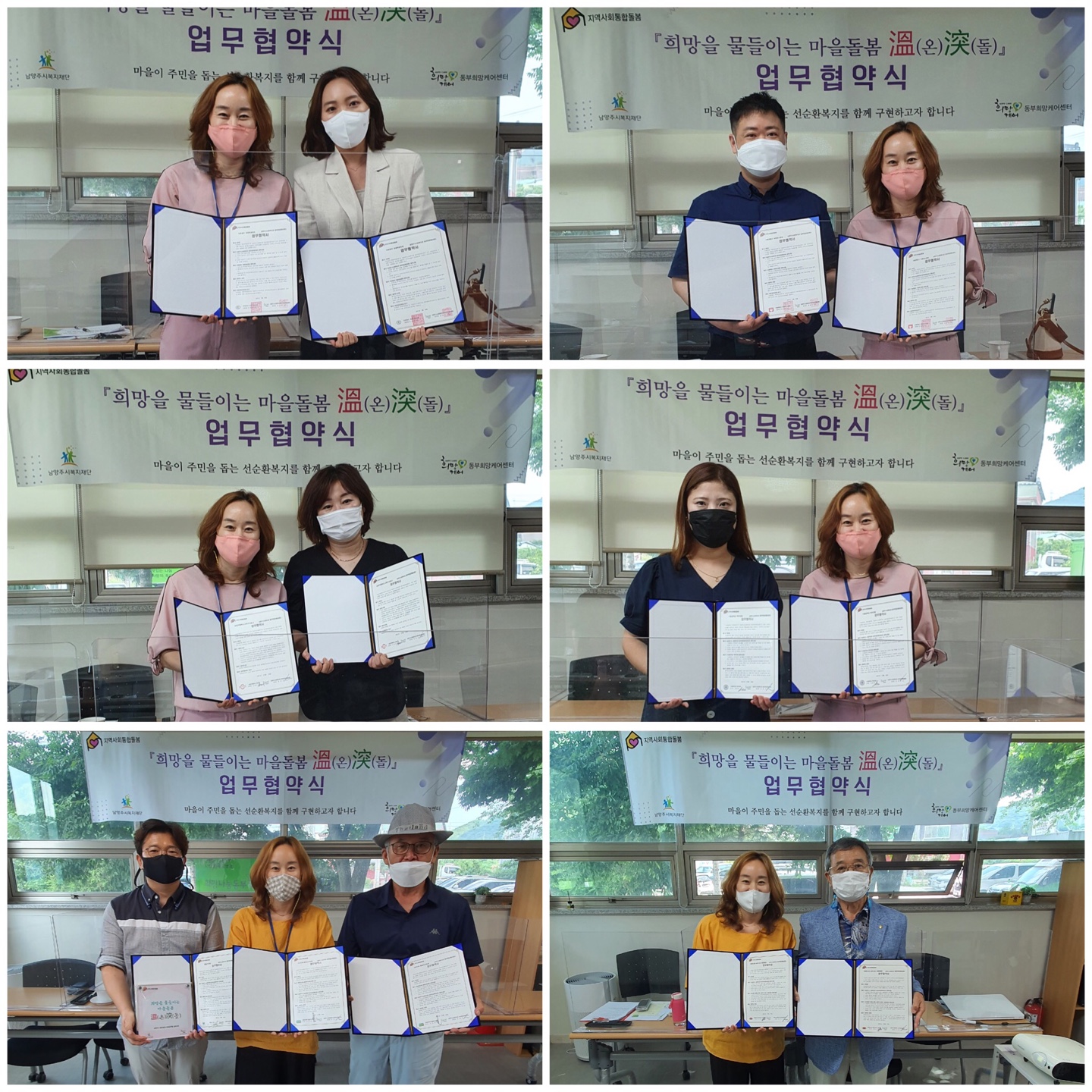 저희 동부희망케어센터에서는 7월 27일 ~ 29일 까지 3일간 코로나19 4단계 방영지침을 준수하여 1:1 릴레이 협약식을 진행하였습니다. 이번 협약식은 (사)대한노인회 남양주시지회 수동면분회, 물골안 공동체, 물골안F&B, 수동중학교 학부모회, 남양주행복도시락, 축령복음병원, 축령정신병원 등 6개 기관과 이웃이 모였으며, 협약식을 통해 대상자 발굴에서 정서적 지원체계형성, 자립지원, 의료지원 등 함께 상호협력을 약속하는 자리가 되었으며, ‘마을이 주민을 돕는 선순환 복지’ 구현을 위한 동참의 뜻을 함께 모으는 귀중한 시간이 되었습니다. 선순환 복지 실천을 위해 시작된 ‘희망을 물들이는 마을돌봄 溫(온)突(돌)사업’에 많은 관심과 응원 부탁드립니다.