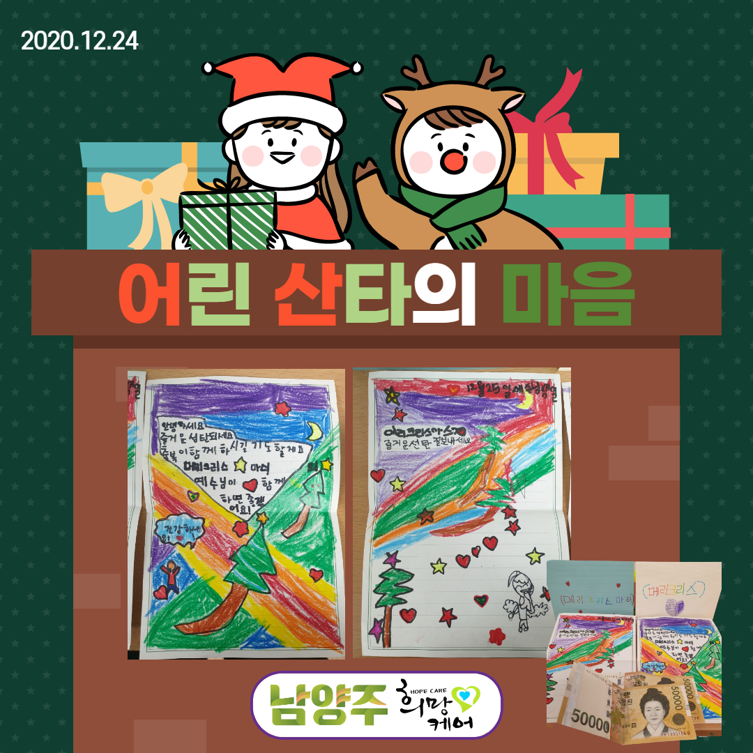 동부희망케어센터 동부희망케어센터, 화도읍 어린산타가 나타나다! 등록일자 2020-12-29 조회 288 내용 크리스마스 이브에 어린산타가 나타났습니다. 크리스마스에 초등학생 두명이 화도읍사무소를 방문하여 크리스마스 편지와 후원금을 전달해주셨습니다. 후원금을 전달해주신 마음 감사드립니다. 전달해주신 후원금은 필요한 곳에 사용하도록 하겠습니다! 감사합니다! 첨부파일 어린산타.jpg [ Size : 868.95KB, Down : 69 ] 미리보기 다운로드 목록보기