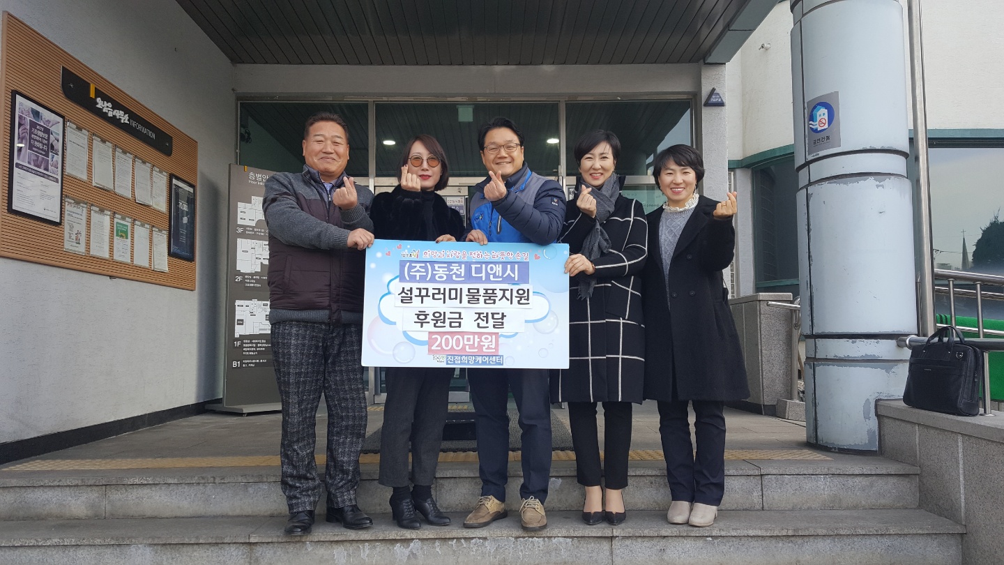 남양주시 오남읍에 위치한 (주)동천디앤시는 지난 12일 북부희망케어센터의 지역 내 저소득 취약계층을 위한 설 선물꾸러미 행사인 ‘응답하라 2018 설마중프로젝트’ 사업에 후원금 200만원을 기탁했다. (주)동천디앤시 김경주 대표는 “어릴 때부터 개인적으로 봉사와 나눔을 꾸준히 해오고 있는 가운데 남양주에 터를 잡은 만큼 지역의 소외계층을 위해 일회성이 아닌 지속적으로 나눔에 참여할 계획이다. 어려운 이웃들에게 힘이 되기 위해 앞으로도 희망케어센터와 함께 하겠다.”라고 전했다. 전달한 후원금은 풍성한 설 선물꾸러미로 구성돼 진접·오남·별내지역 저소득 취약계층 300가구에 전달돼 진다. 한편, (주)동천디앤시는 지역사회 내 어려운 이웃들을 위해 지속적으로 나눔 활동을 펼치고 있다.
