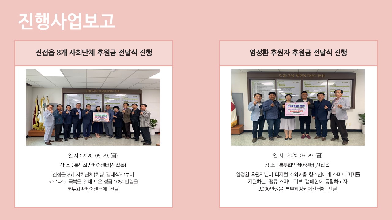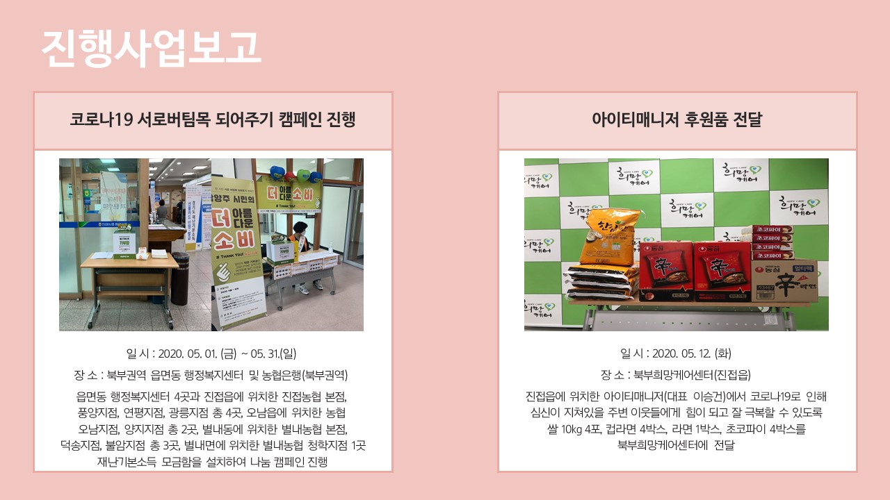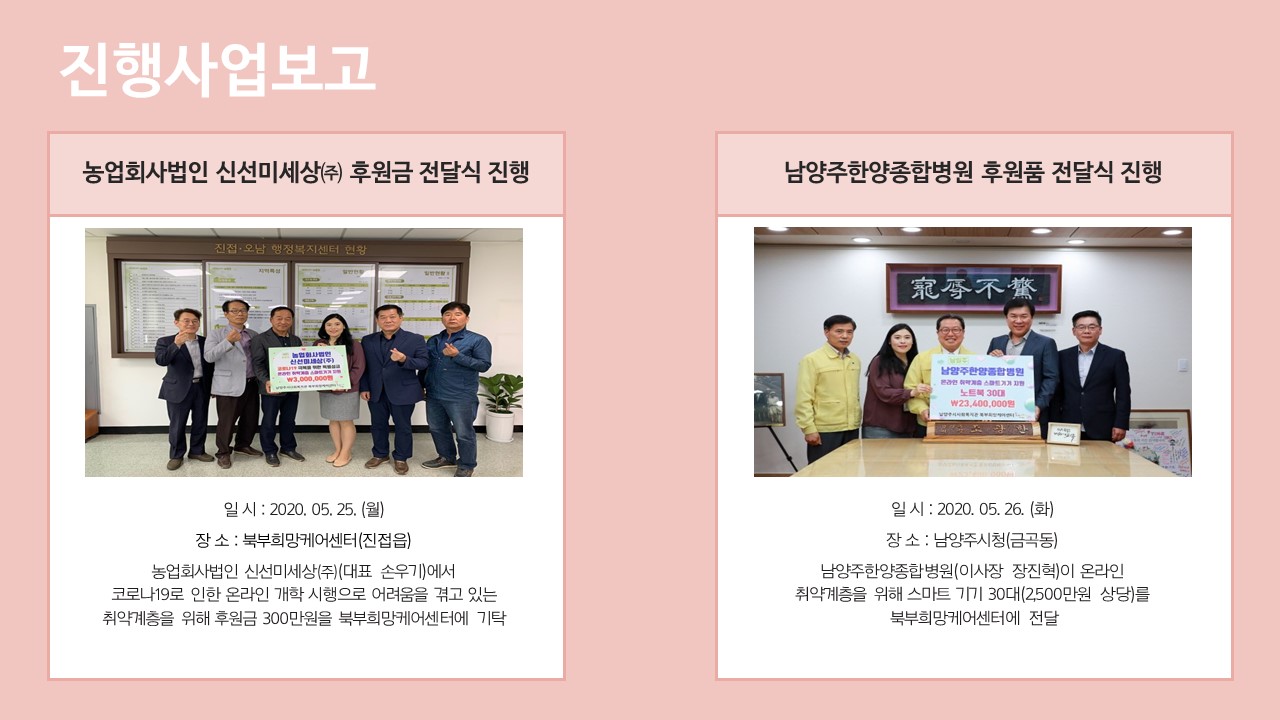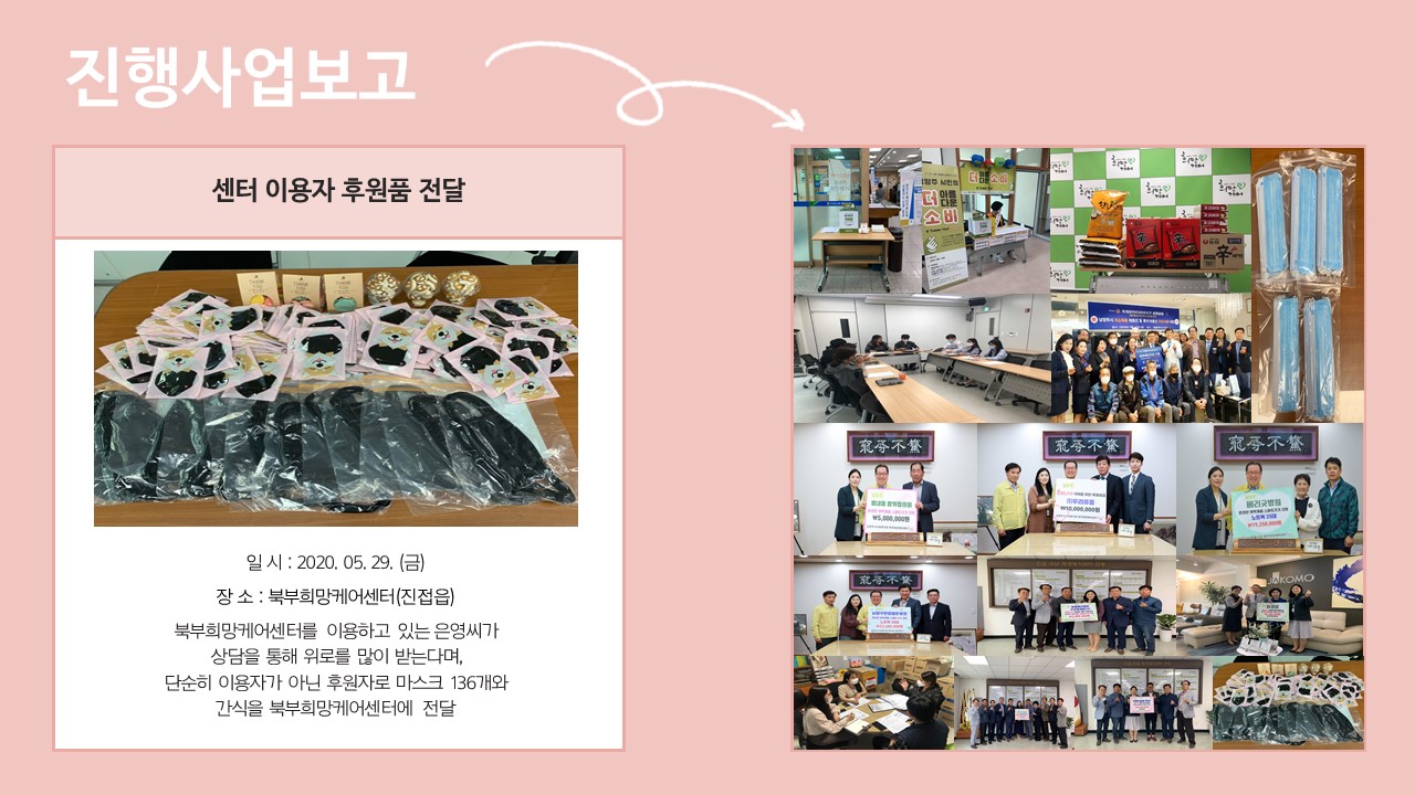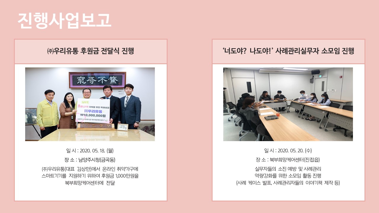 북부희망케어센터는 지난 2020년 5월 지역사회와 다양한 사업을 진행하였습니다. 항상 북부희망케어센터와 지역사회를 위해 나눔을 해주시는 모든 분께 감사드립니다. 자세한 내용은 이미지를 참고해주세요.