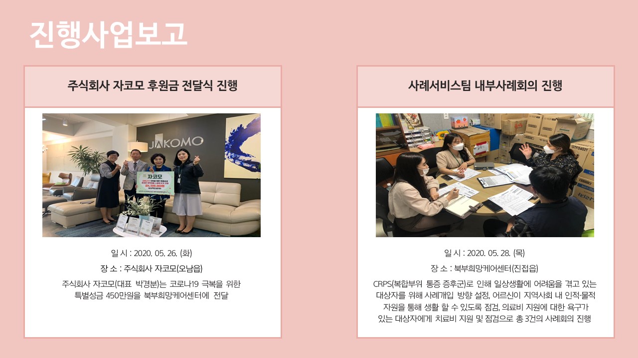 북부희망케어센터는 지난 2020년 5월 지역사회와 다양한 사업을 진행하였습니다. 항상 북부희망케어센터와 지역사회를 위해 나눔을 해주시는 모든 분께 감사드립니다. 자세한 내용은 이미지를 참고해주세요.