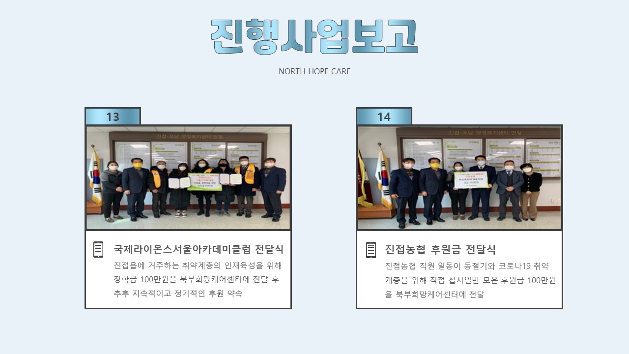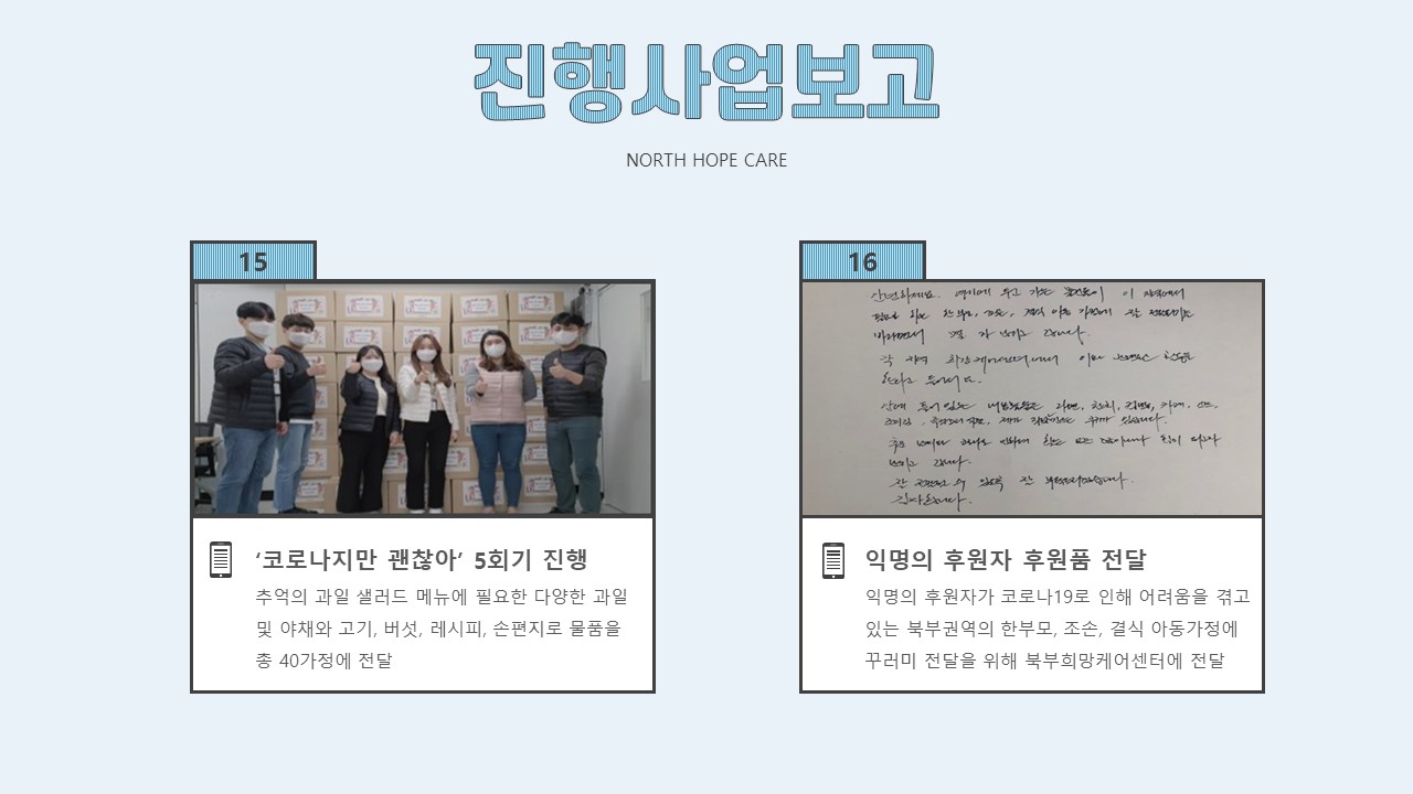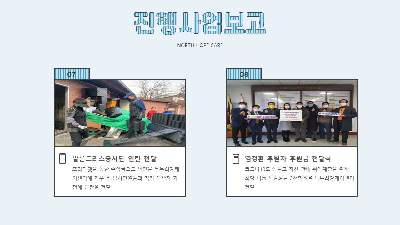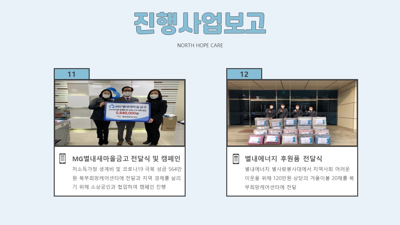 북부희망케어센터는 지난 2020년 12월 지역사회와 다양한 사업을 진행하였습니다. 항상 북부희망케어센터와 지역사회를 위해 나눔을 해주시는 모든 분께 감사드립니다. 자세한 내용은 이미지를 참고해주세요.