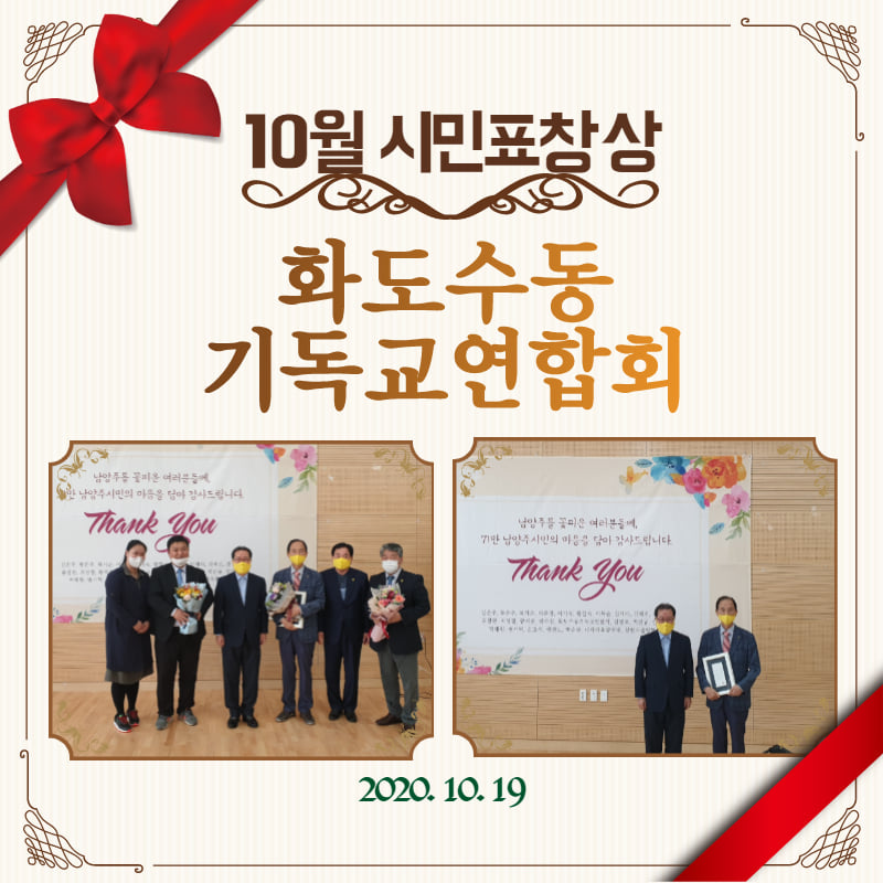 10월 19일 남양주시장상은 화도수동기독교연합회에서 수상하였습니다. 화도수동기독교연합회에서는 남양주시에 150개의 교회연합을 운영하시면서 사랑의 쌀을 지원하고, 청소년들에게 필요한 장학금을 후원하며 능동적인 봉사활동 실천하였습니다. 그외에도 다양한 도움으로 화도수동에 나눔을 전파하고 계십니다. 수상을 진심으로 축하드립니다.