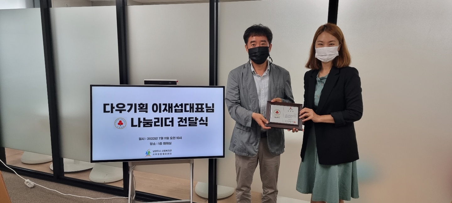 남양주시 사회복지관 서부희망케어센터(센터장 신영미)는 지난 11일 다산동에 위치한 다우기획의 이재섭 대표에게 ‘나눔리더’ 인증패를 전달했다.