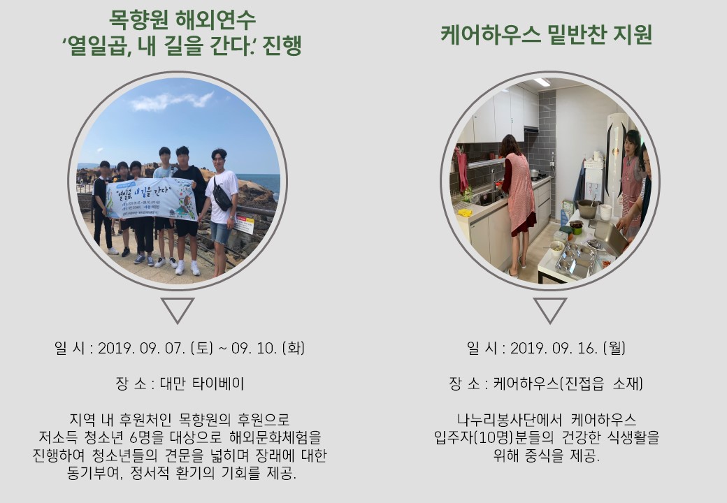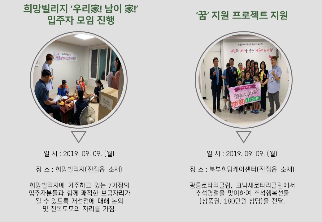북부희망케어센터는 지난 9월 지역사회와 다양한 사업을 진행하였습니다. 항상 북부희망케어센터와 지역사회를 위해 나눔을 해주시는 모든 분께 감사드립니다. 자세한 내용은 이미지를 참고해주세요.