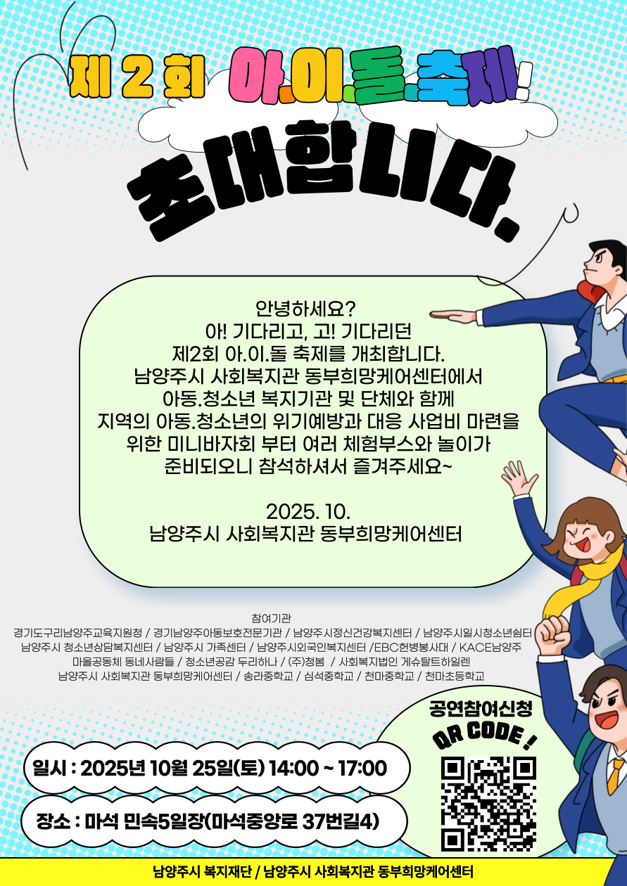 저희 동부희망케어센터와 아동, 청소년 복지기관 및 단체와 함께 제2회 아.이.돌 축제를 개최합니다.