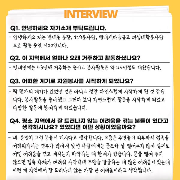 - 별내면에는 43년째 거주하는 중이고 봉사활동은 약 25년정도 해왔습니다.