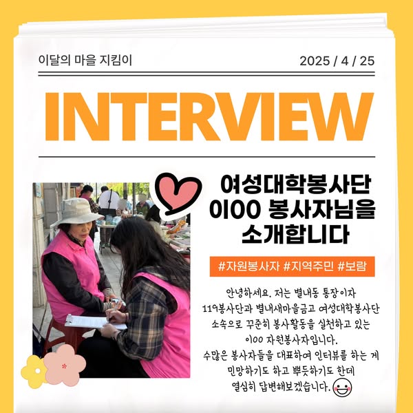 지난 25일 북부희망케어센터는 별내면 소재 별내새마을금고에서 주민 만나기 활동을 진행하였으며, 자원봉사자 인터뷰를 통해 다양한 이야기를 들어볼 수 있었습니다. 25년간 꾸준한 봉사를 실천한 자원봉사자분과의 마을 이야기 지금 바로 만나보시죠!