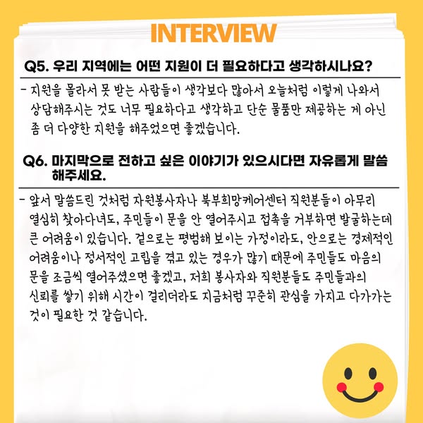 - 앞서 말씀드린 것처럼 자원봉사자나 북부희망케어센터 직원분들이 아무리 열심히 찾아다녀도, 주민들이 문을 안 열어주시고 접촉을 거부하면 발굴하는데 큰 어려움이 있습니다. 겉으로는 평범해 보이는 가정이라도, 안으로는 경제적인 어려움이나 정서적인 고립을 겪고 있는 경우가 많기 때문에 주민들도 마음의 문을 조금씩 열어주셨으면 좋겠고, 저희 봉사자와 직원분들도 주민들과의 신뢰를 쌓기 위해 시간이 걸리더라도 지금처럼 꾸준히 관심을 가지고 다가가는 것이 필요한 것 같습니다.