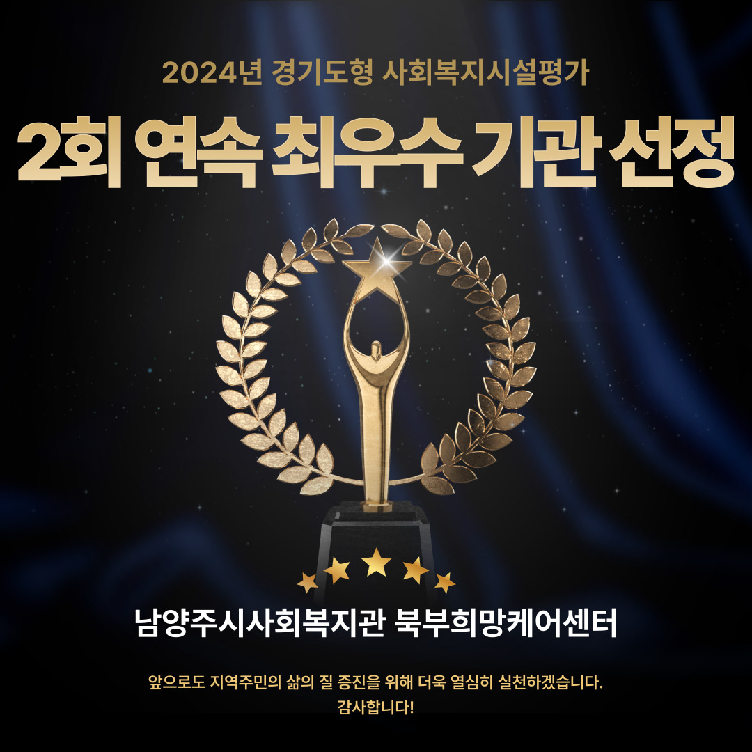 남양주시사회복지관 북부희망케어센터(센터장 전정수)에서는 2022년에 이어 연속 2회 경기도형 사회복지시설 평가(평가기간 2021년~2023년)에서 최우수 등급인 'A등급'을 받았습니다!
