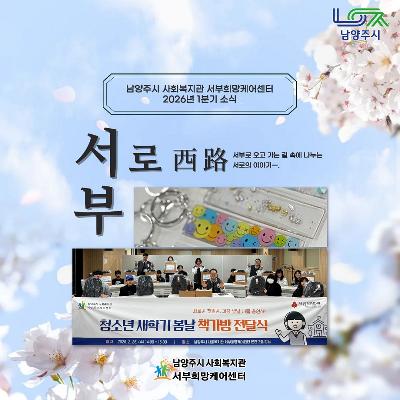 게시판 검색 구분 : 구분 전체보기 전체 동부희망케어센터 서부희망케어센터 남부희망케어센터 북부희망케어센터 검색 영역 : 전체 검색제목내용검색어 : 검색하기 서부희망케어센터 [2026년 1분기 소식] 서부희망케어센터 소식지 〈서부·서로(西路)〉 발간 소식지 〈서부·서로(西路)〉가 2026년의 1분기 소식을 안고 찾아왔습니다.이웃과 함께여서 더 빛났던 지난 계절의 기록, 지금 바로 확인해 보세요! ▼▼▼ 아래 이미지 클릭하여 더 다양한 소식 확인하기 ▼▼▼https://pf.kakao.com/_Tvdxmxj/112972732 2026-04-07 서부희망케어센터 [서부희망케어센터] 정을 심고, 관계를 키우는 ‘다산텃밭’ 감자 심기 진행 정을 심고, 관계를 키우는 ‘다산텃밭’ 감자 심기 진행 지난 4월 2일, 다산텃밭에서 지역 주민들과 함께 올 한 해 풍성한 수확을 기원하며 감자 심기 활동을 진행했습니다. 이번 활동은 활동가님이 미리 정성껏 싹을 틔워 준비해주신 감자 모종을 고른 흙 위에 하나씩 심으며 시작되었습니다. 주민들은 나란히 서서 흙을 만지고 손을 맞추며, 이웃과의 거리도 자연스럽게 좁혀가는 소중한 시간을 가졌습니다.오늘 심은 감자가 건강하게 잘 자라나길 바라며, 서부희망케어센터는 올 한 해도 텃밭 활동을 통해 주민 간의 정을 나누고 따뜻한 관계를 키워나갈 예정입니다. 앞으로 다산텃밭에서 쑥쑥 자라날 작물들의 소식에도 많은 관심과 기대를 부탁드립니다!#다산텃밭 #서부희망케어센터 #감자심기 #도시농부 #이웃사촌 #공동체활동 #나눔실천... 2026-04-06 서부희망케어센터 [서부희망케어센터] 1인가구 커뮤니티 공간 돌봄사업: ‘함께Hair’ & ‘함께Day’ 현장 소식 1인가구 커뮤니티 공간 돌봄사업: ‘함께Hair’ & ‘함께Day’ 현장 소식지난 3월, 서부희망케어센터에서는 이웃 간의 따뜻한 정을 나누고 서로를 돌보는 소중한 시간들이 이어졌습니다.* 마음까지 다듬는 ‘함께Hair’ 이미용 서비스 (3/18, 3/25) *미용실 이용이 어려운 주민들을 위해 전문가 원장님이 직접 찾아와 머리를 단정히 다듬어 드리고, 이웃들과 오순도순 이야기를 나누며 온기를 더하는 활동입니다. 이번 활동은 ‘행복실은 가위손 봉사단’의 정성 어린 손길로 진행되었습니다.* 일상의 활력을 더하는 ‘함께Day’ 문화 서비스 (3/19, 3/27) *지역 주민들이 함께 고전 영화를 관람하며 일상의 즐거움을 찾고, 서로 소통하며 돌봄 문화를 형성하는 활동입니다. ‘다산1동 새마을부녀회’에서 따뜻한 마... 2026-04-06 서부희망케어센터 [서부희망케어센터] 생필품 꾸러미에 담긴 큰 마음, 다산동숭교회의 따뜻한 실천 생필품 꾸러미에 담긴 큰 마음, 다산동숭교회의 따뜻한 실천 지난 3월 30일(월), 다산동숭교회에서 부활절을 맞아 지역사회 소외계층을 위한 생필품 꾸러미 30개를 서부희망케어센터에 전달해 주셨습니다.이번 꾸러미는 에코백, 김, 햇반, 파스, 수건 등 실질적으로 도움이 되는 물품들로 알차게 구성되었습니다. 특히 교회 성도분들께서 구성부터 준비까지 직접 참여하여 나눔의 가치를 더욱 깊게 더해주셨습니다.전달된 꾸러미는 지역 내 어르신들께 소중히 전달되었습니다. 한 어르신께서는 "요즘 물가가 올라 장보기가 부담스러웠는데, 꼭 필요한 것들로 챙겨주셔서 큰 도움이 된다"며 감사의 마음을 전하셨습니다.정성 가득한 나눔으로 이웃에게 따뜻한 위로를 전해주신 다산동숭교회 성도 여러분께 진심으로 감사드립니다. 서부희망케어센터는... 2026-04-06 서부희망케어센터 희망하우스봉사단 3월 주거환경개선활동 소식 희망하우스봉사단 3월 주거환경개선활동 소식지난 3월 28일(금), 희망하우스봉사단이 퇴계원읍에 거주하시는 1인 가구 어르신 댁을 방문하여 주거환경개선활동을 진행했습니다. 이번 활동은 지난해 발생한 누수로 곰팡이가 핀 장판을 교체하고, 오래되어 삐걱거리던 안방문 경첩을 수리하는 등 어르신의 안전하고 건강한 생활을 지원하는 데 집중했습니다.또한, 봉사단원분들은 어르신께서 다가오는 여름을 쾌적하게 보내실 수 있도록 낡은 방충망을 새것으로 교체하고, 집안 곳곳을 꼼꼼하게 방역해 주셨습니다. 정성 어린 손길들이 모여 어르신의 일상에 소중한 변화를 선물한 하루였습니다. 따뜻한 마음으로 구슬땀을 흘려주신 희망하우스봉사단원 여러분께 진심으로 감사드립니다.#희망하우스봉사단 #주거환경개선 #서부희망케어센터 #퇴계원읍 #집수... 2026-04-06 서부희망케어센터 [슬기로운 나눔생활, 이달의 후원자_2월] [슬기로운 나눔생활, 이달의 후원자_2월] 2026년 2월에도 웃음 가득한 지역사회를 만들기 위해 총 190명(곳)의 후원자가 서부희망케어센터와 함께해 주셨습니다. , "dis": false, "ds": { "ti": "", "la": "ko", "cr": "", "su": "", "de": "", "cd": "2026-04-06T00:37:22.966Z", "ke": "" --> -->, "dh": { "do": { "pa": 1, "fo": 1, "en": 1, "pi": 1, "tb": 1, "eq": 1 -->, "fo": [ ], "cd": { "tp": 0, "lc": { "af": false, "ui": false, "fu": false, "dn... 2026-04-06 서부희망케어센터 [이달의 봉사자(2월) - ‘함께헤어’ 이명애 봉사자(행복실은 가위손)] [이달의 봉사자(2월) - ‘함께헤어’ 이명애 봉사자(행복실은 가위손)] 오늘은 1인가구 커뮤니티 공간 돌봄사업 ‘함께 헤어’를 