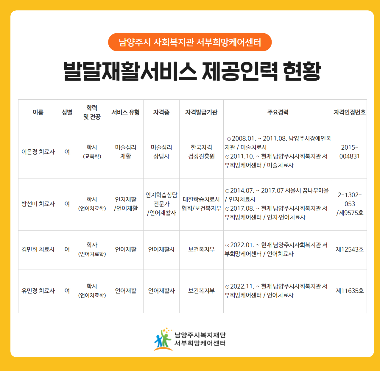 서부희망케어센터 2024년 희망가족상담치료실 발달재활서비스 제공인력 현황 및 단가 안내 등록일자 2024-02-16 조회 314 내용 희망가족상담치료실 발달재활서비스 제공인력 현황과 서비스 비용을 공고합니다. 참고하시기 바랍니다. 첨부파일 발달재활서비스 제공인력 현황(2024.02).jpg [ Size : 556.66KB, Down : 87 ] 미리보기 다운로드 희망가족상담치료실 이용안내(서비스 단가).jpg [ Size : 710.01KB, Down : 70 ] 미리보기 다운로드 목록보기