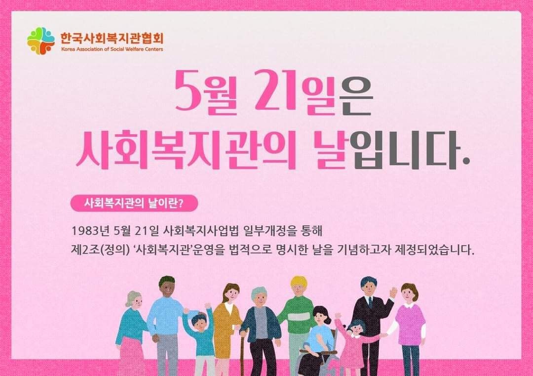 서부희망케어센터 서부희망케어센터, 5월 21일은 사회복지관의 날입니다. 등록일자 2022-05-18 조회 203 내용 5월 21일은 사회복지관의 날입니다. '사회복지관'운영을 법적으로 명시한 날을 기념하고자 제정되었습니다~ 첨부파일 사회복지관의 날.jpg [ Size : 116.13KB, Down : 66 ] 미리보기 다운로드 사회복지관의 날 경기도복지중심.png [ Size : 857.49KB, Down : 71 ] 미리보기 다운로드 경기도복지중심 목록보기
