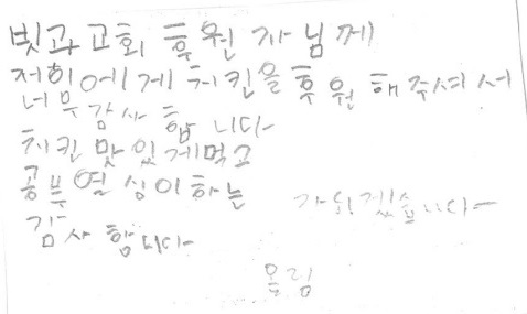 오늘은 퇴계원읍 아이들이 '치킨 잘 먹었다'며 후원자님께 감사 편지 3통을 보내주었는데, 그 편지들을 소개하고자 합니다.