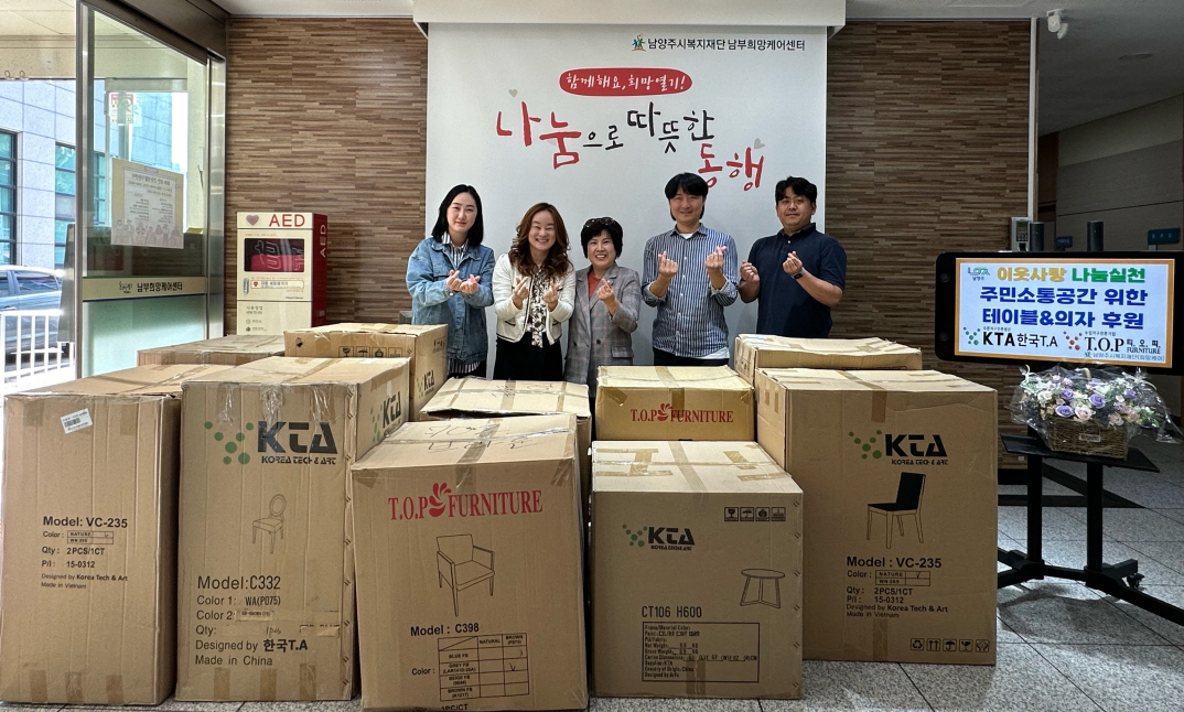 한국T.A/㈜티오피퍼니처는 사회복지공동모금회 아너소사이어티 회원으로서 2013년부터 남양주시 소외 계층을 위해 지속적으로 나눔활동을 펼쳐오고 있으며 특히 마을 회관과 남부, 동부희망케어센터의 어려운 이웃을 위해 가구를 지원하며 나눔 문화 확산에 기여하고 있습니다.