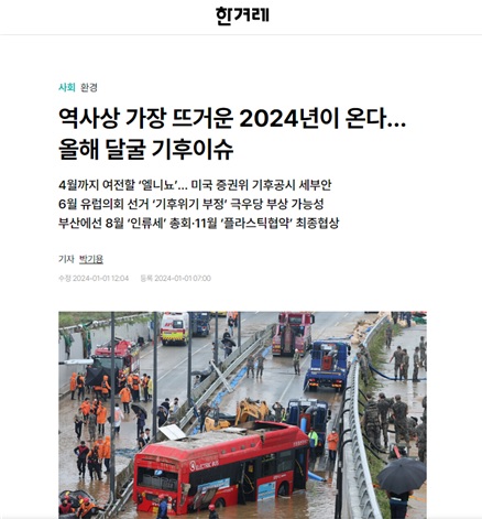 **2024-01-01 한계레 신문, 사회 환경 기사 “역사상 가장 뜨거운 2024년이 온다...”