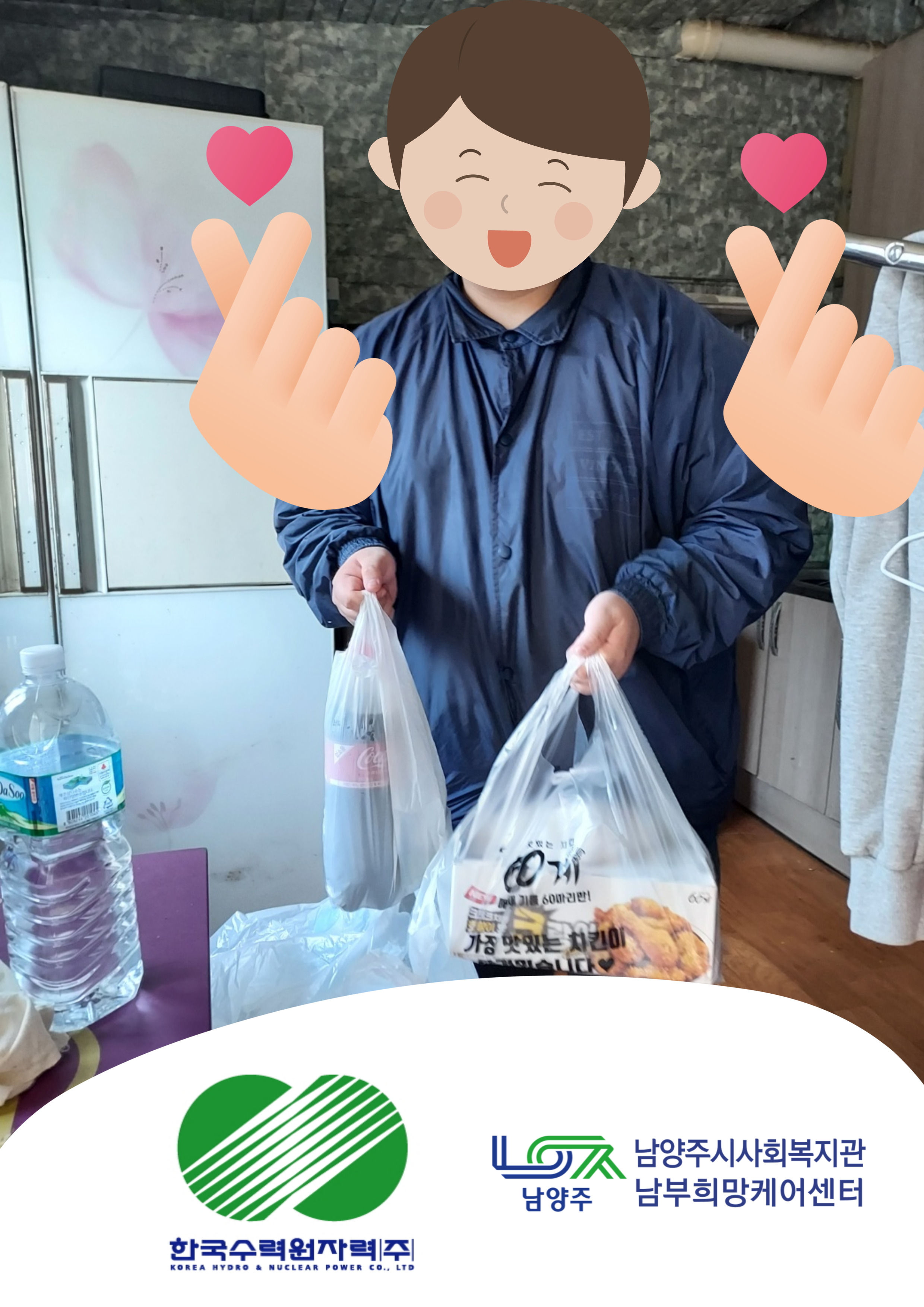 따뜻한 피자와 치킨을 조안 가족들에게 잘 전달했습니다.